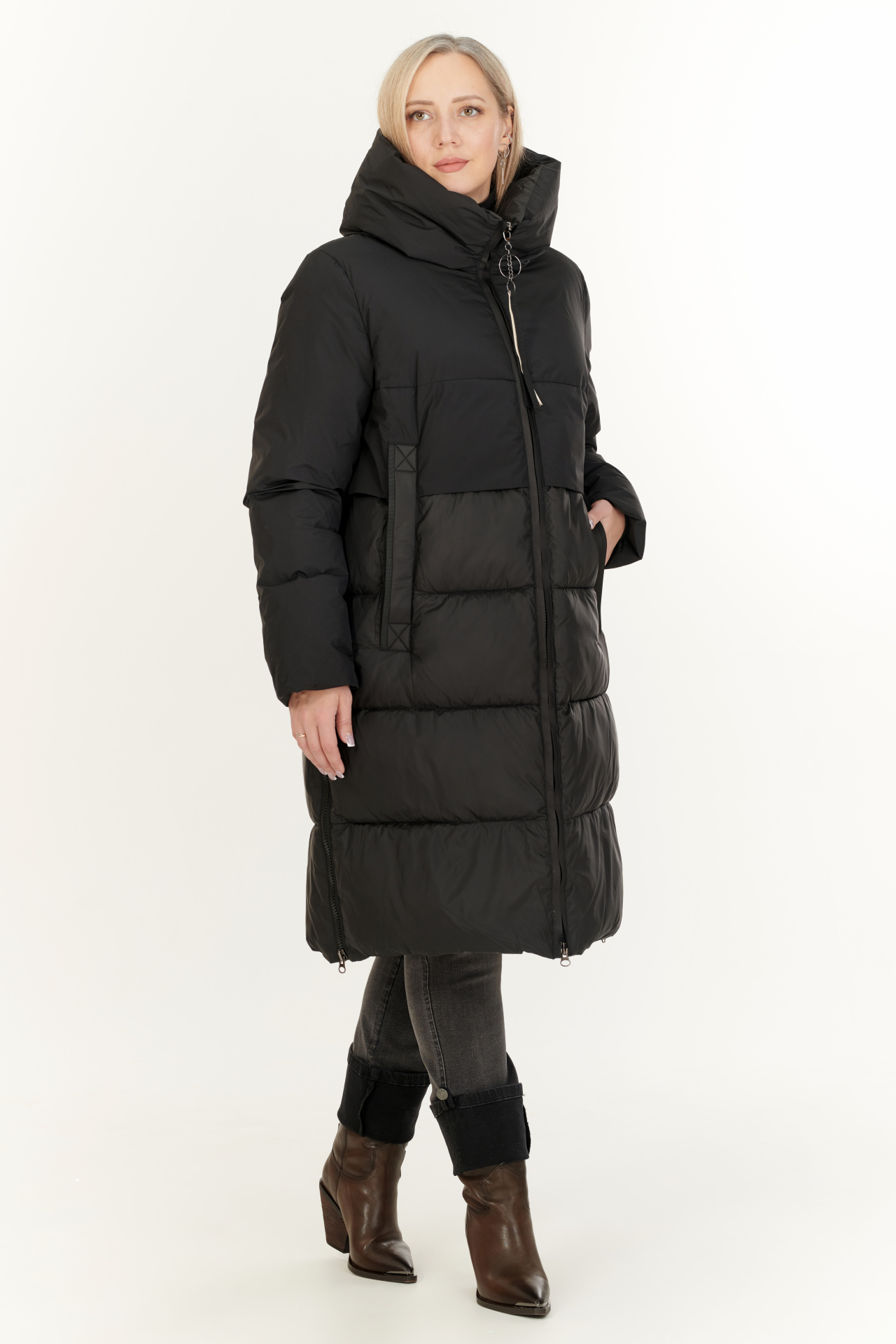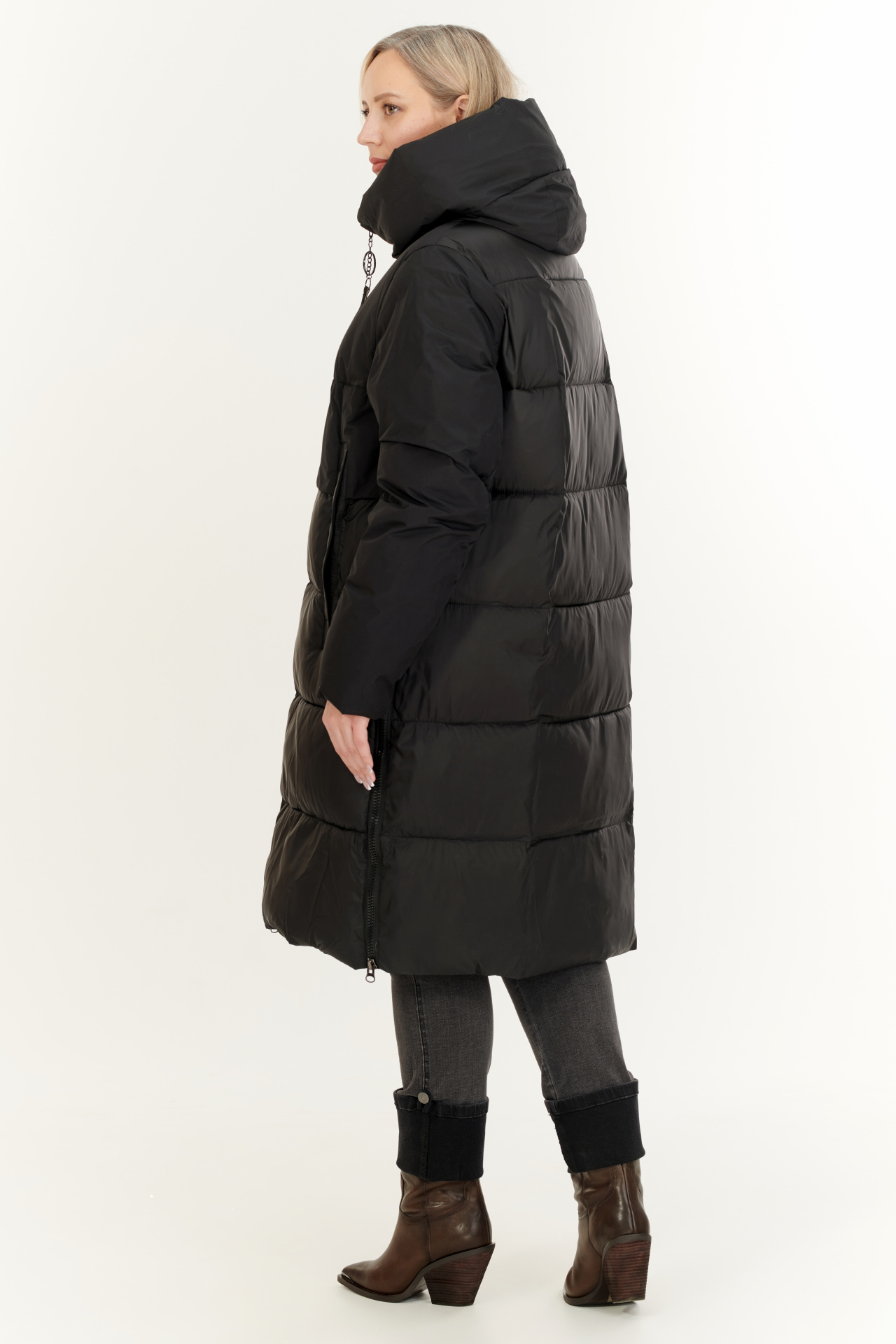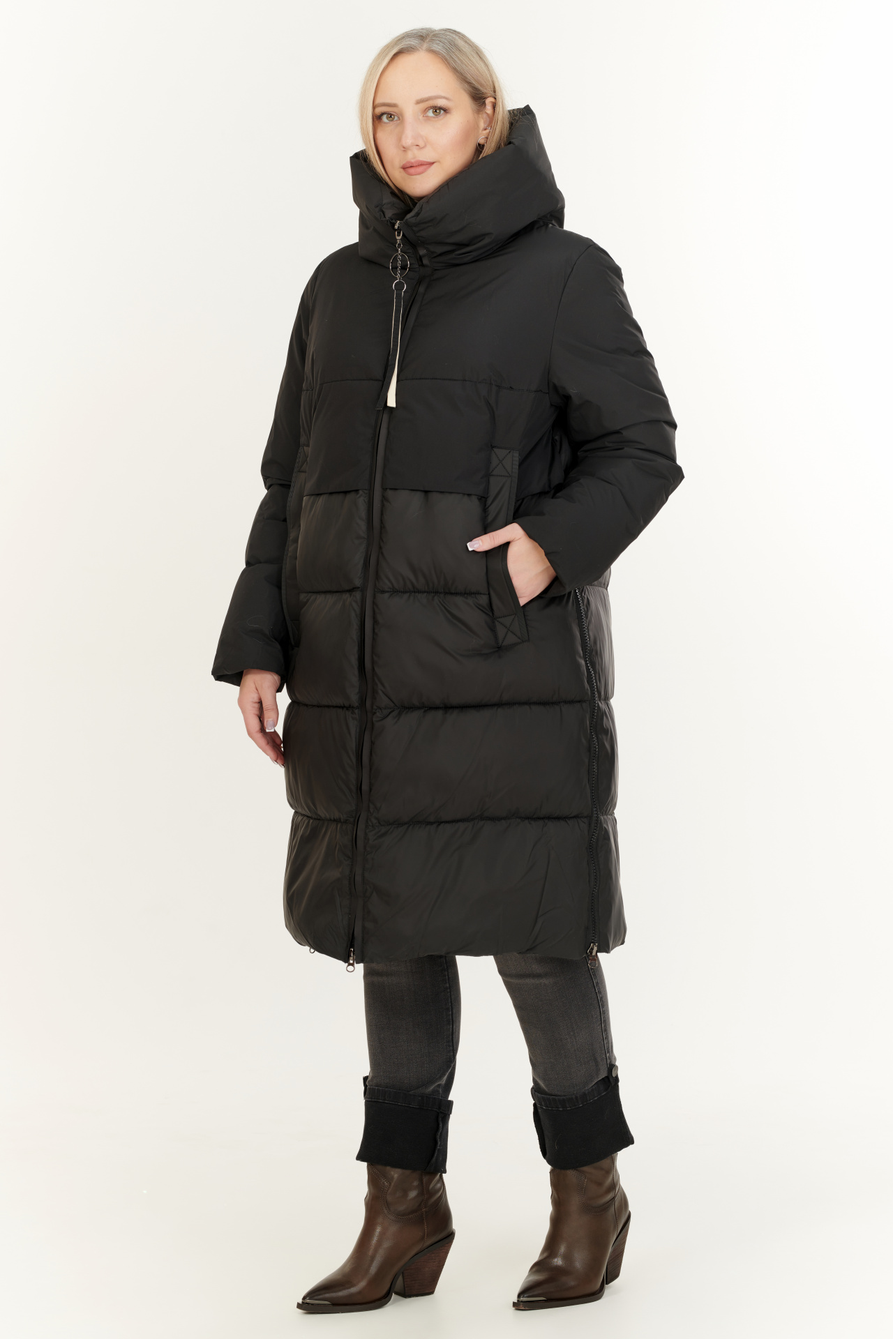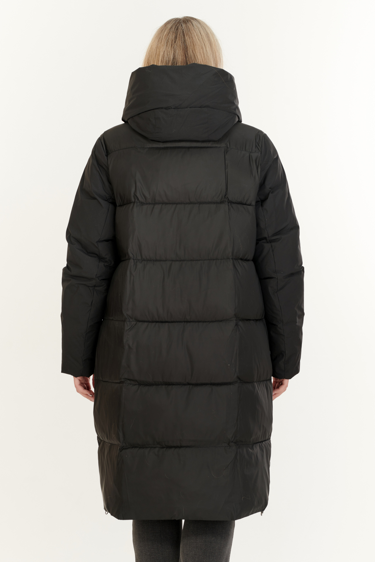 Утепленный пуховик в черном цвете. Модель прямого силуэта с капюшоном, прорезными карманами и застежкой на молнию.