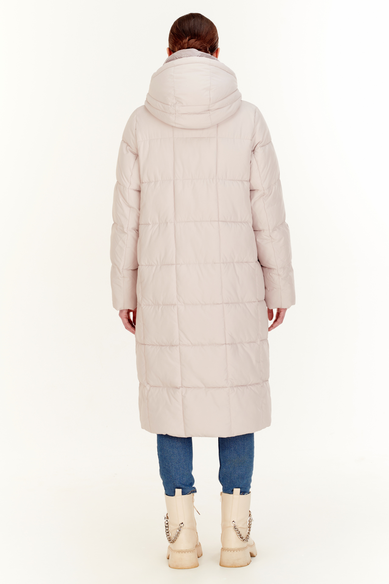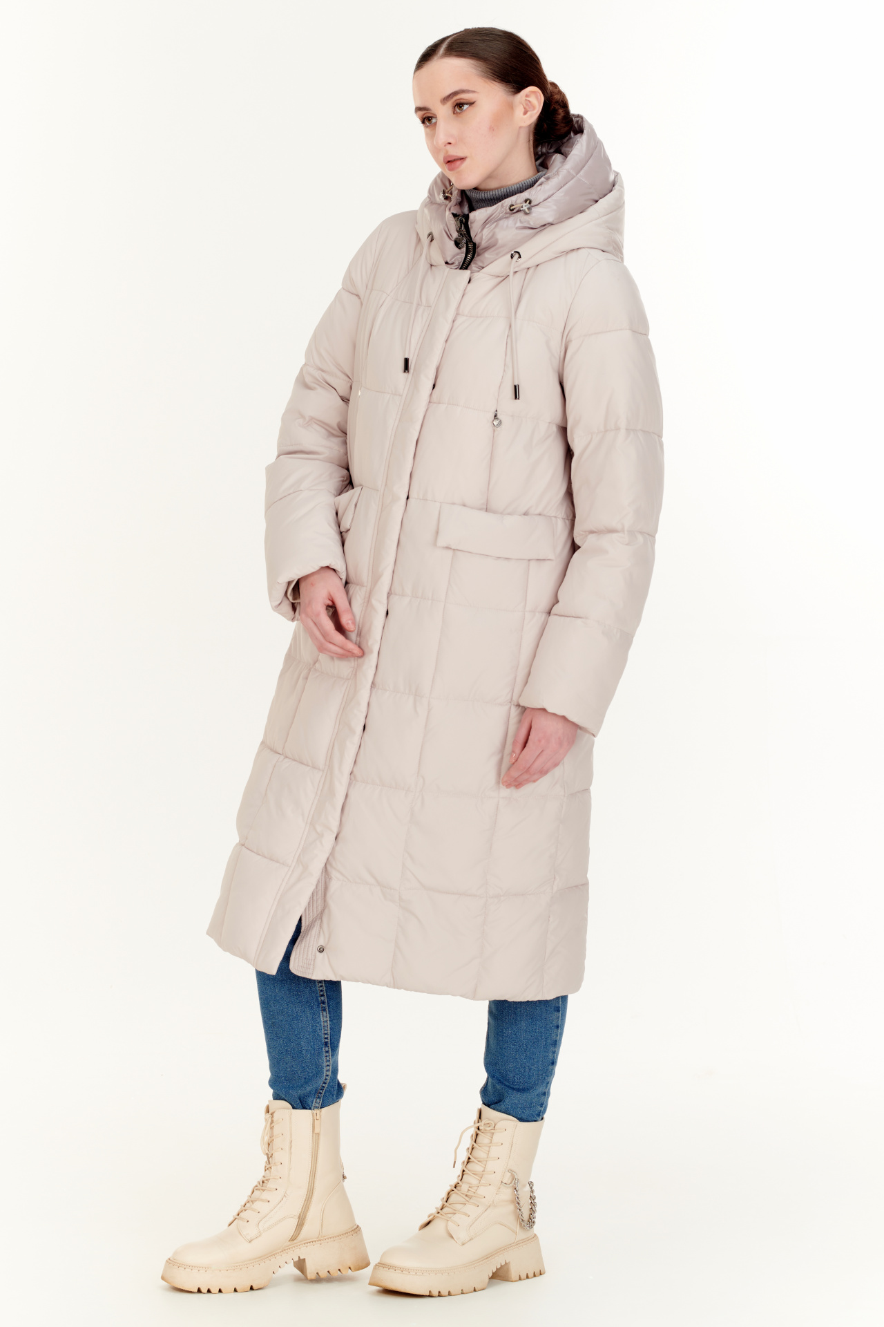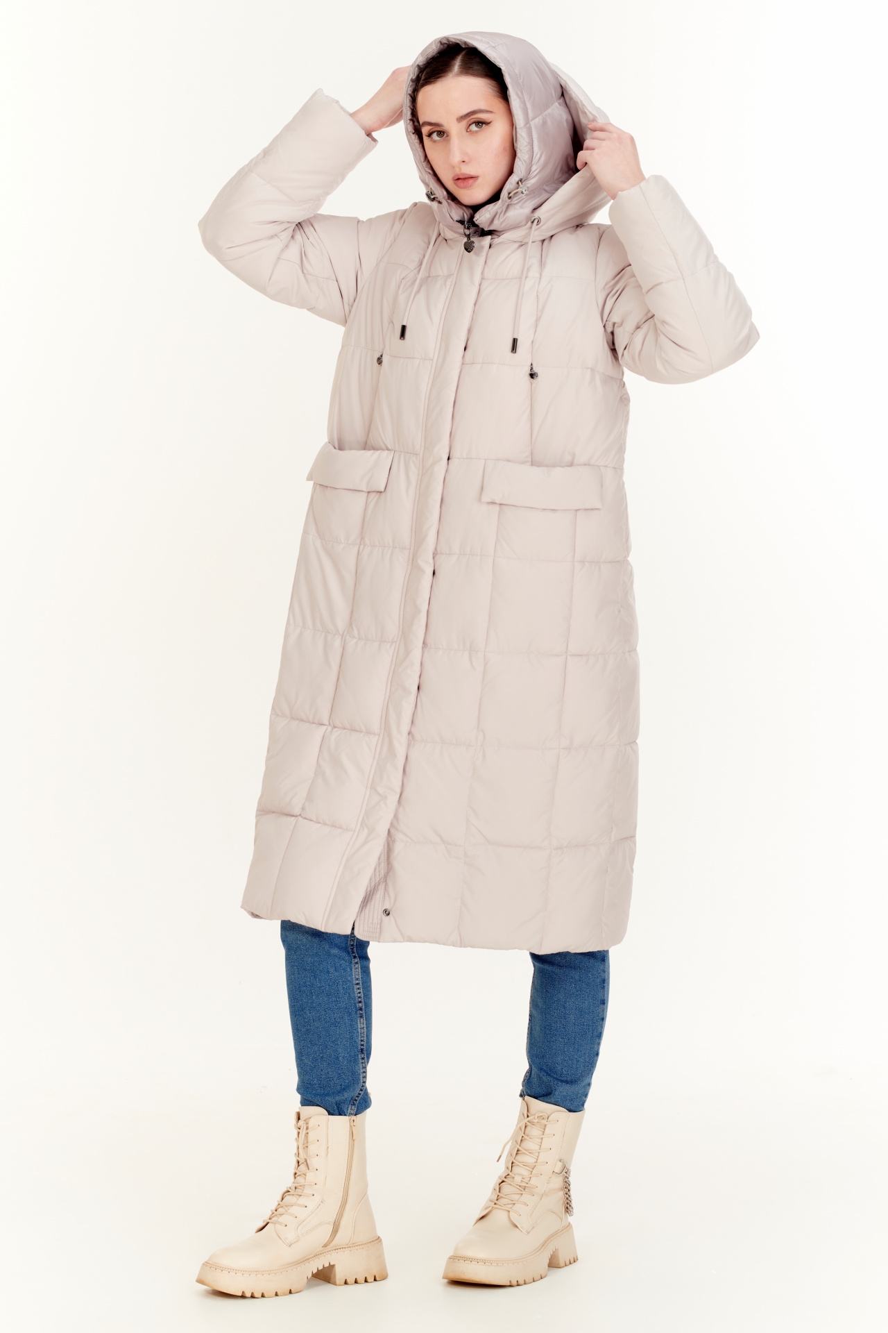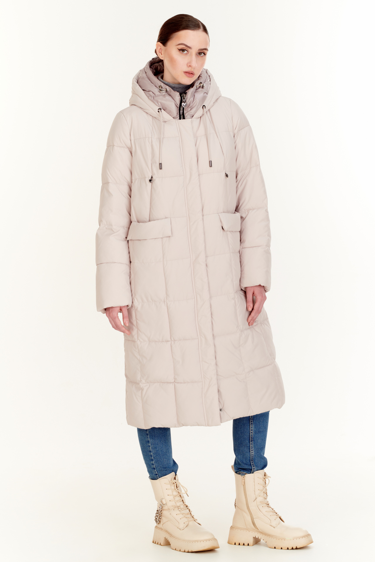 Утепленный пуховик в светло-бежевом цвете. Модель прямого силуэта с капюшоном, накладными карманами, застежкой на молнию и планку с кнопками.