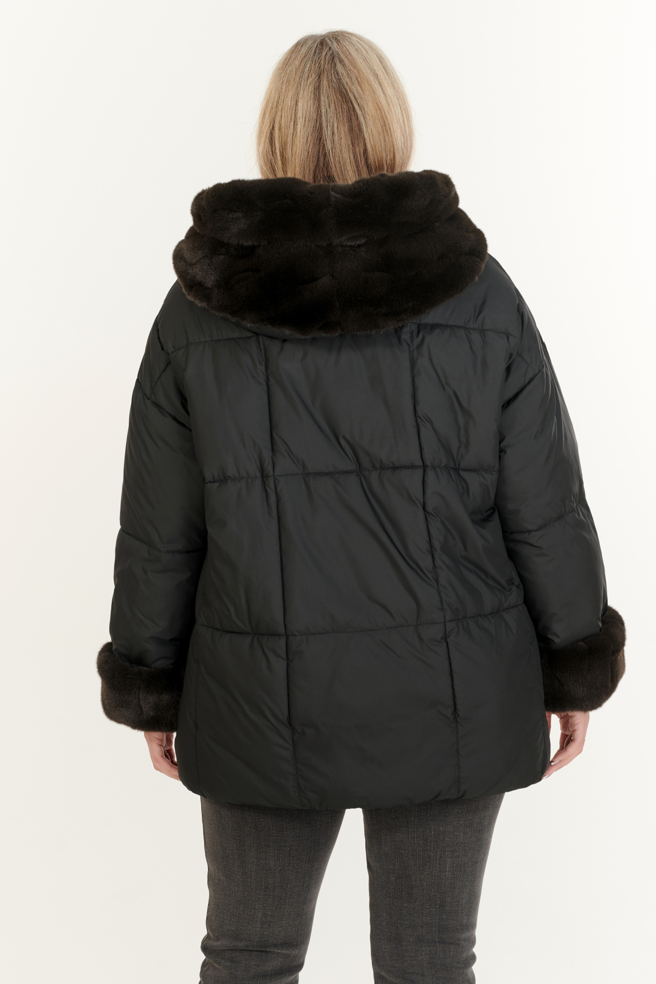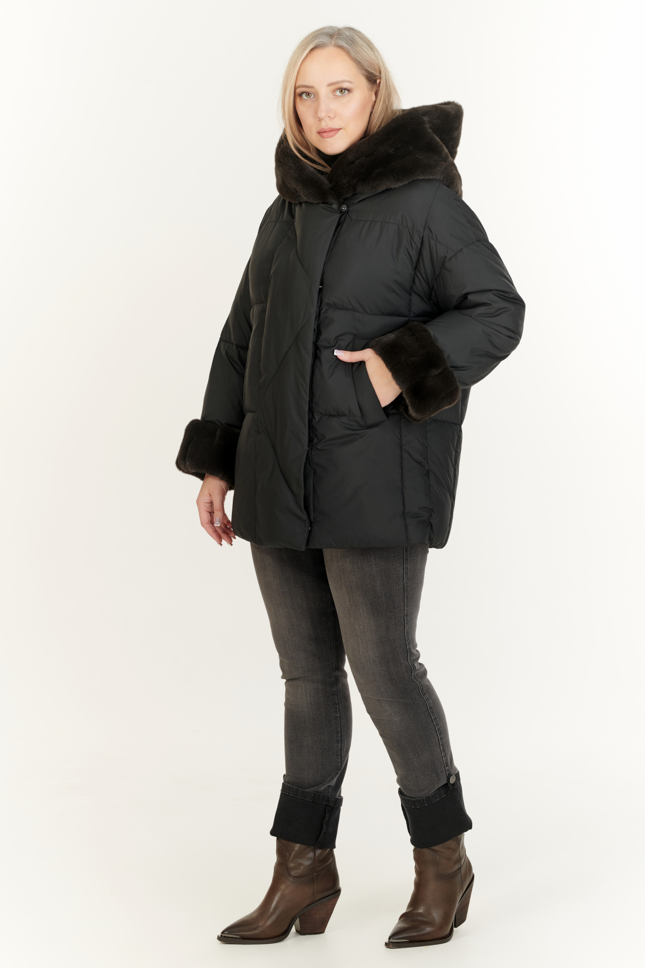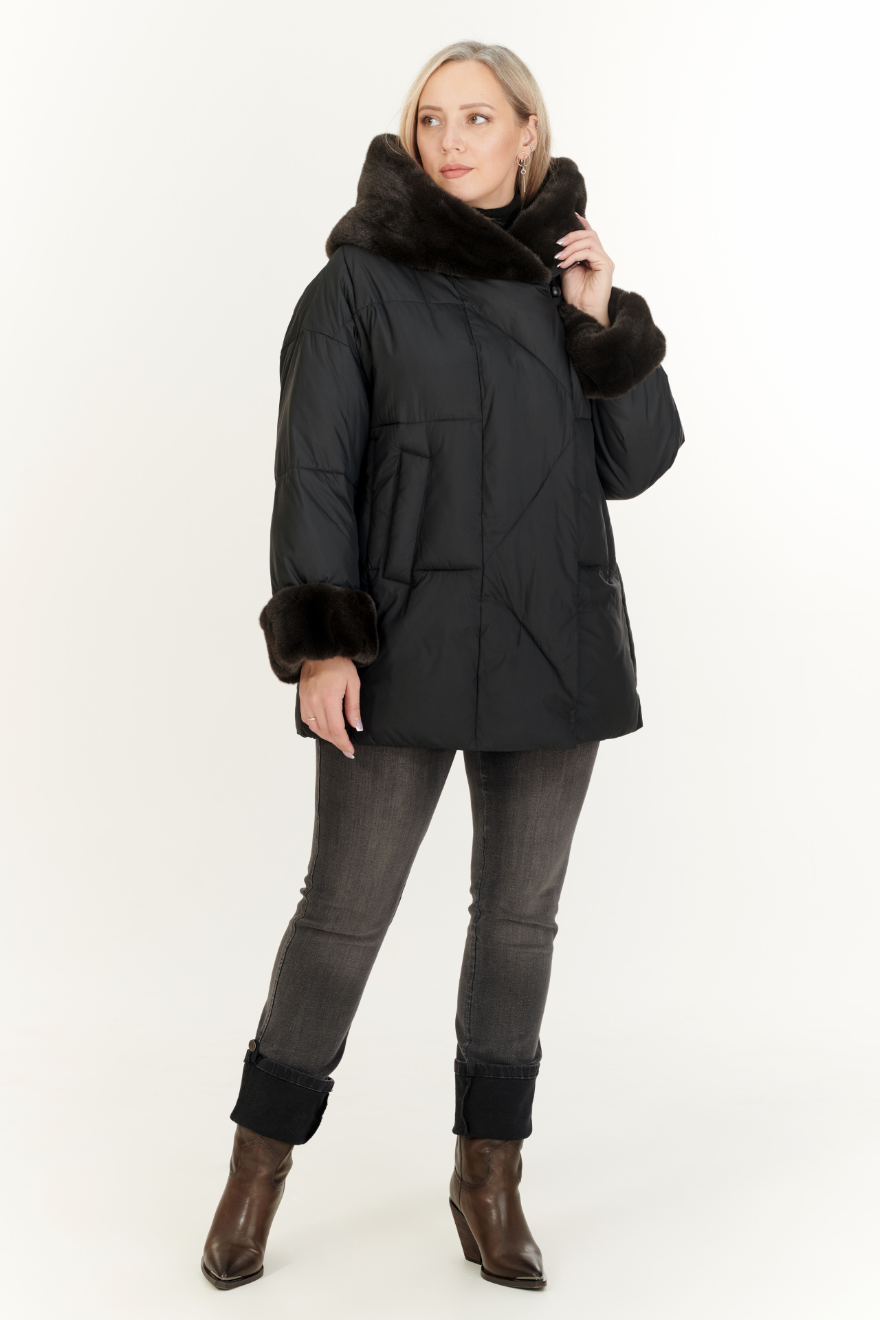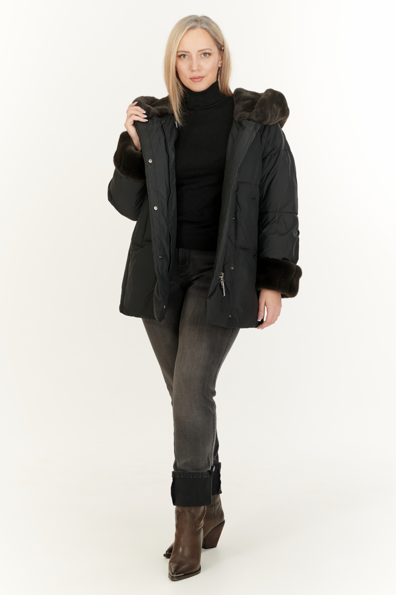 Утепленный биопухом пуховик в черном цвете. Модель прямого силуэта с капюшоном, прорезными карманами, застежкой на молнию и планку с кнопками. Отделка экомех.