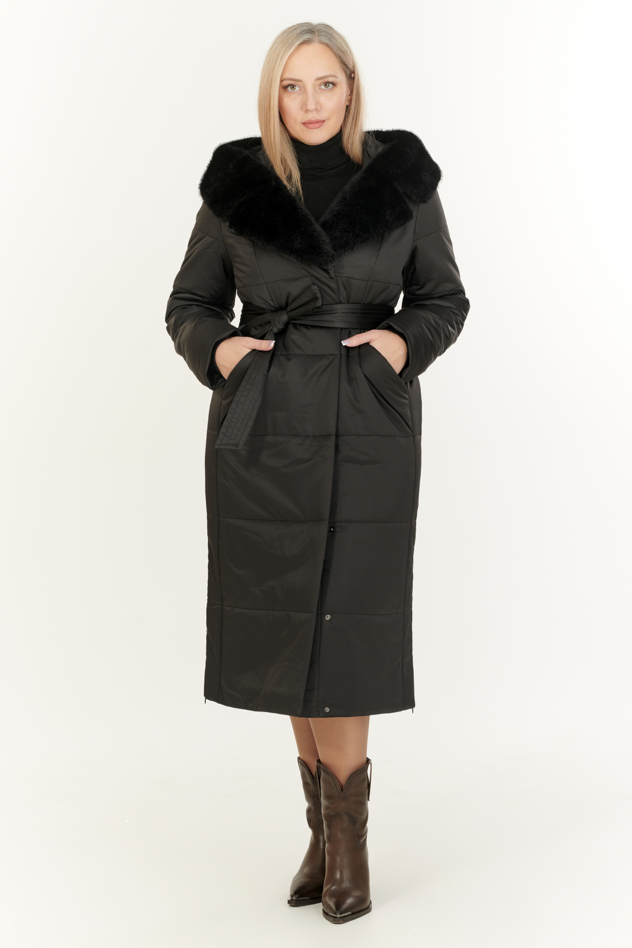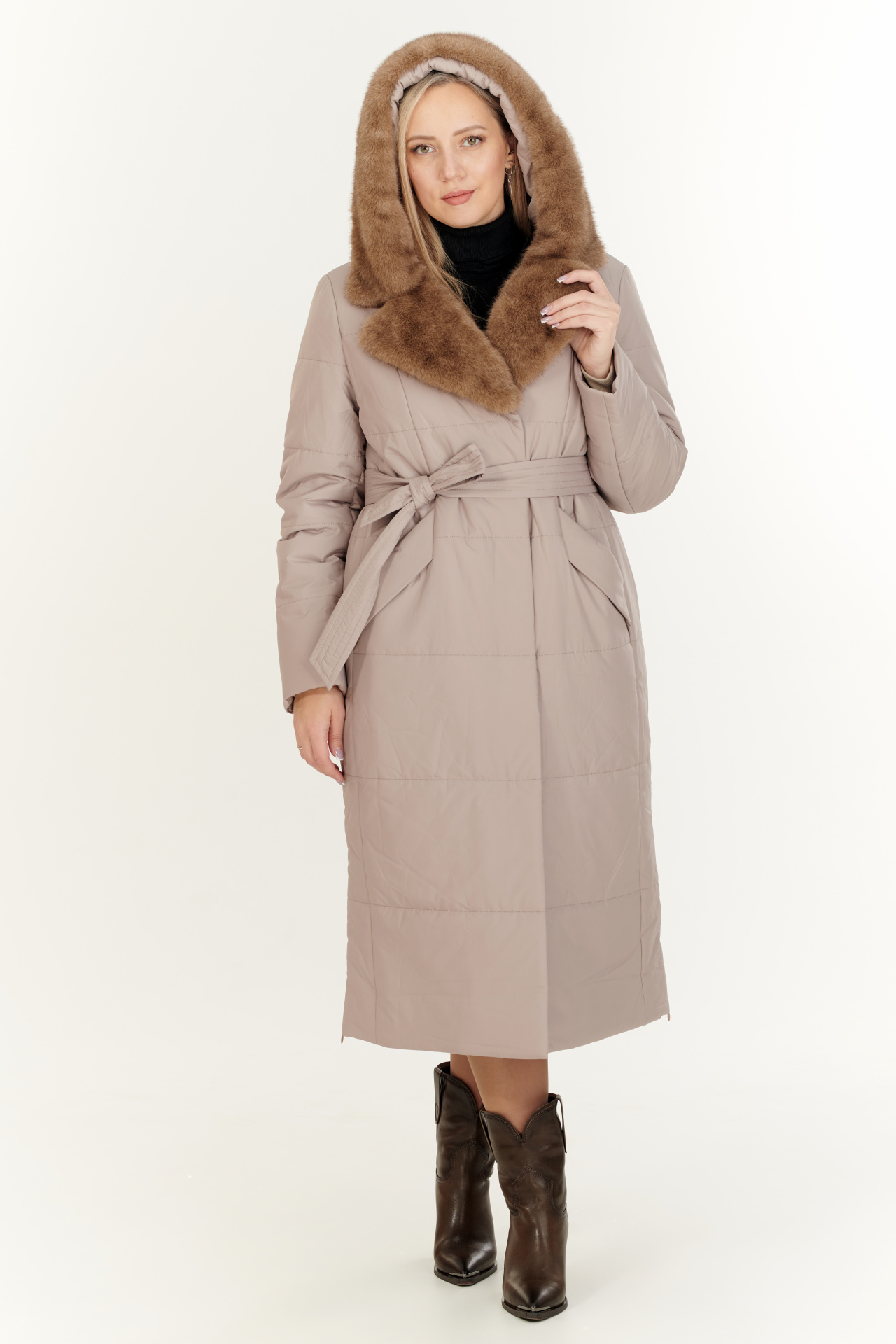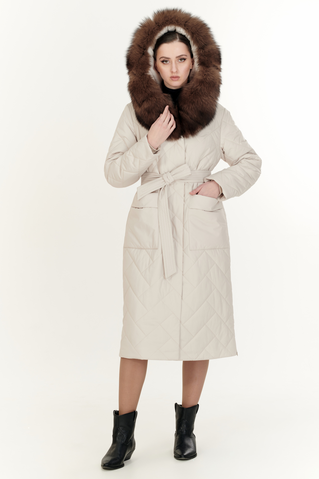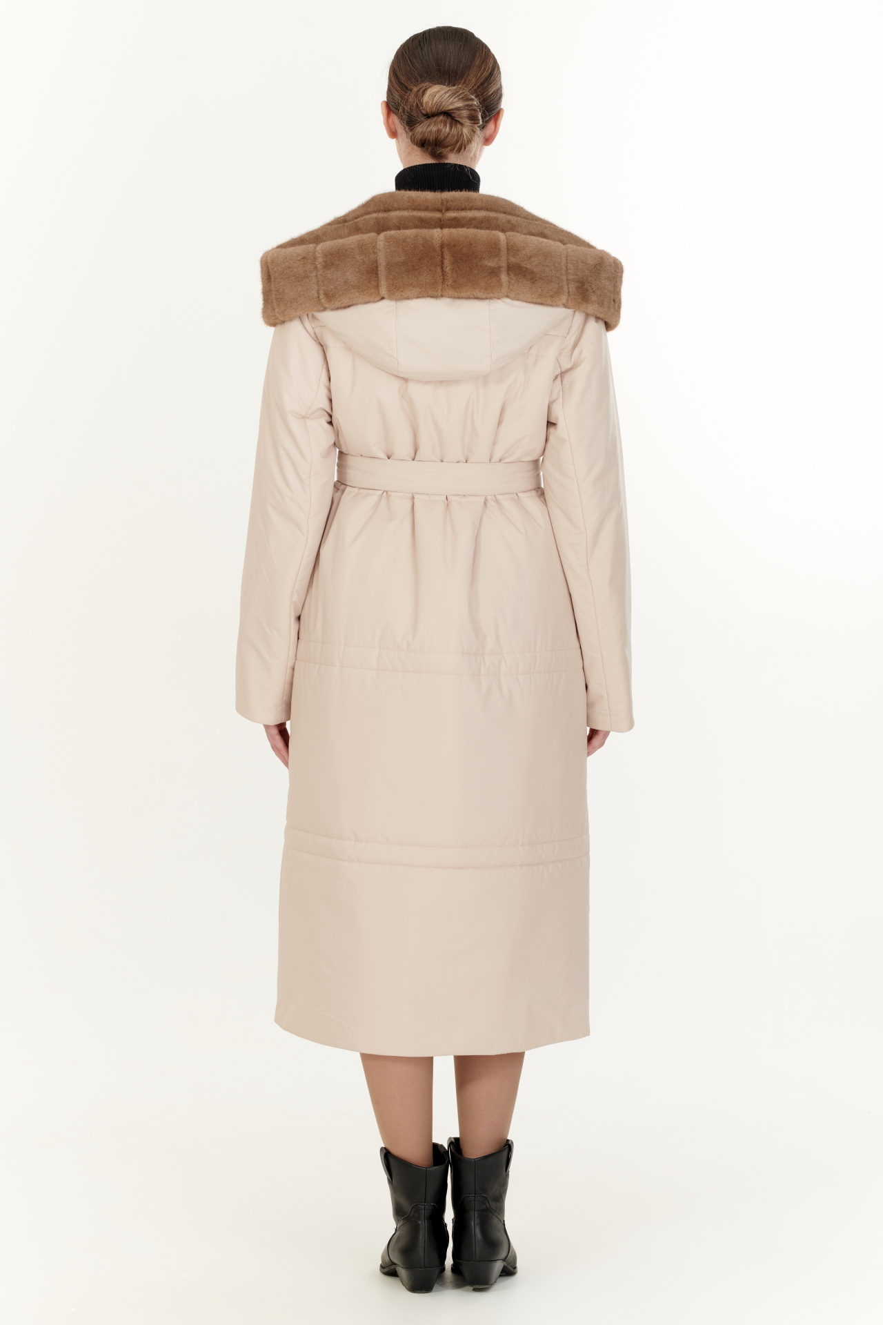 Утепленный тинсулейтом пуховик в тёмно-коричневом цвете. Модель прямого силуэта с капюшоном и поясом, прорезными карманами, застежкой на молнию и планку с кнопками. Отделка экомех