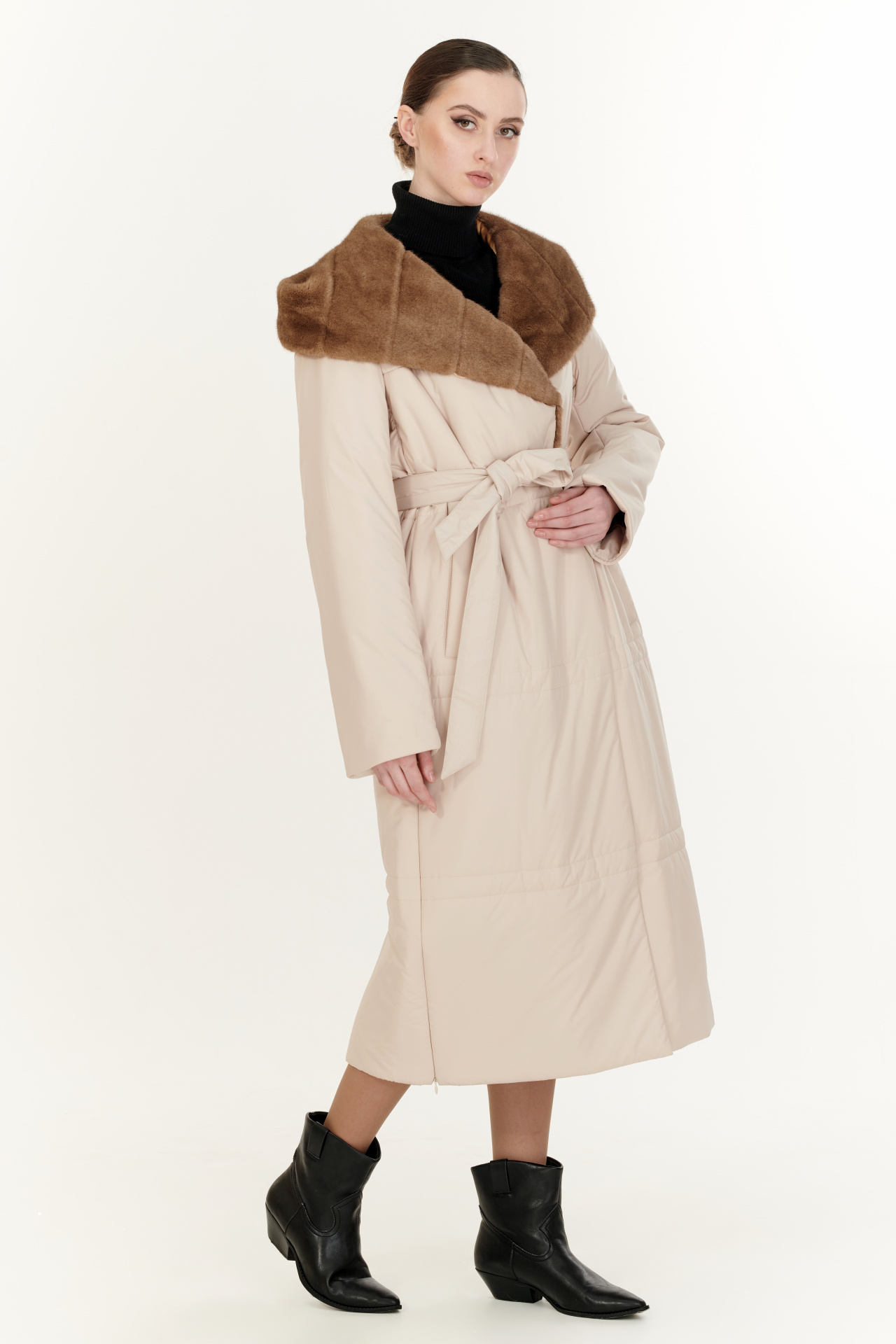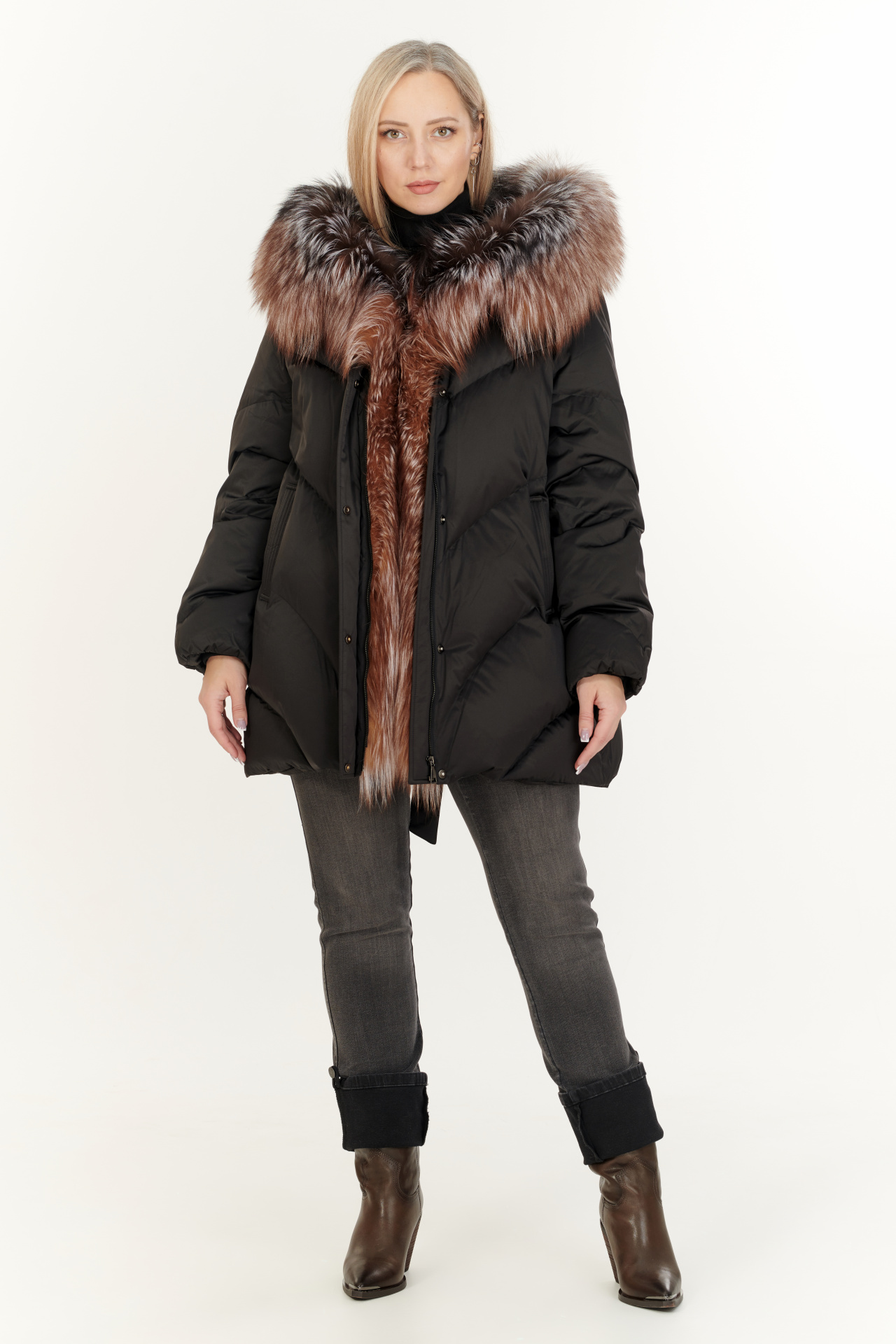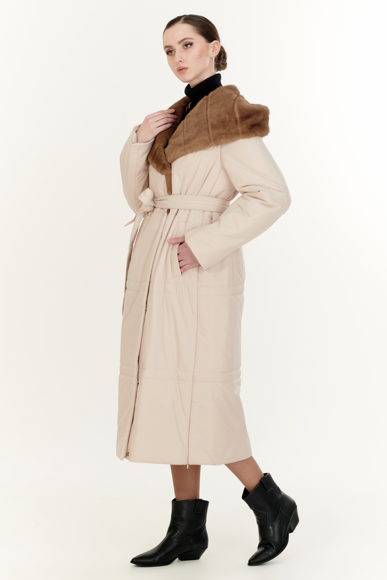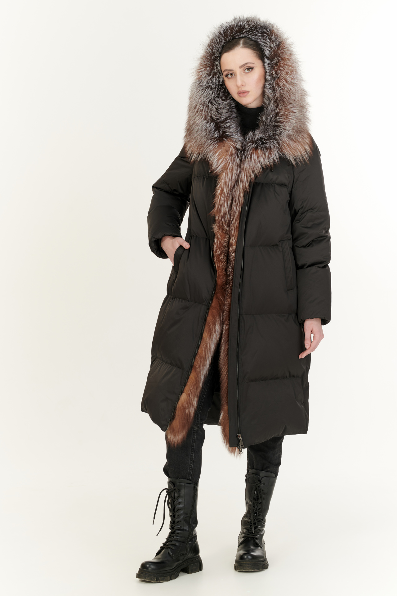 Утепленный тинсулейтом пуховик в тёмно-коричневом цвете. Модель прямого силуэта с капюшоном и поясом, прорезными карманами, застежкой на молнию и планку с кнопками. Отделка экомех