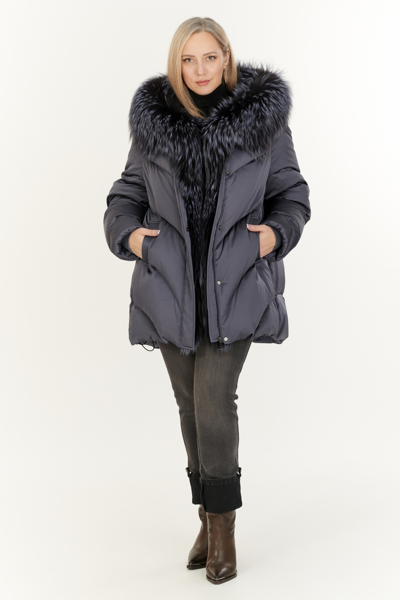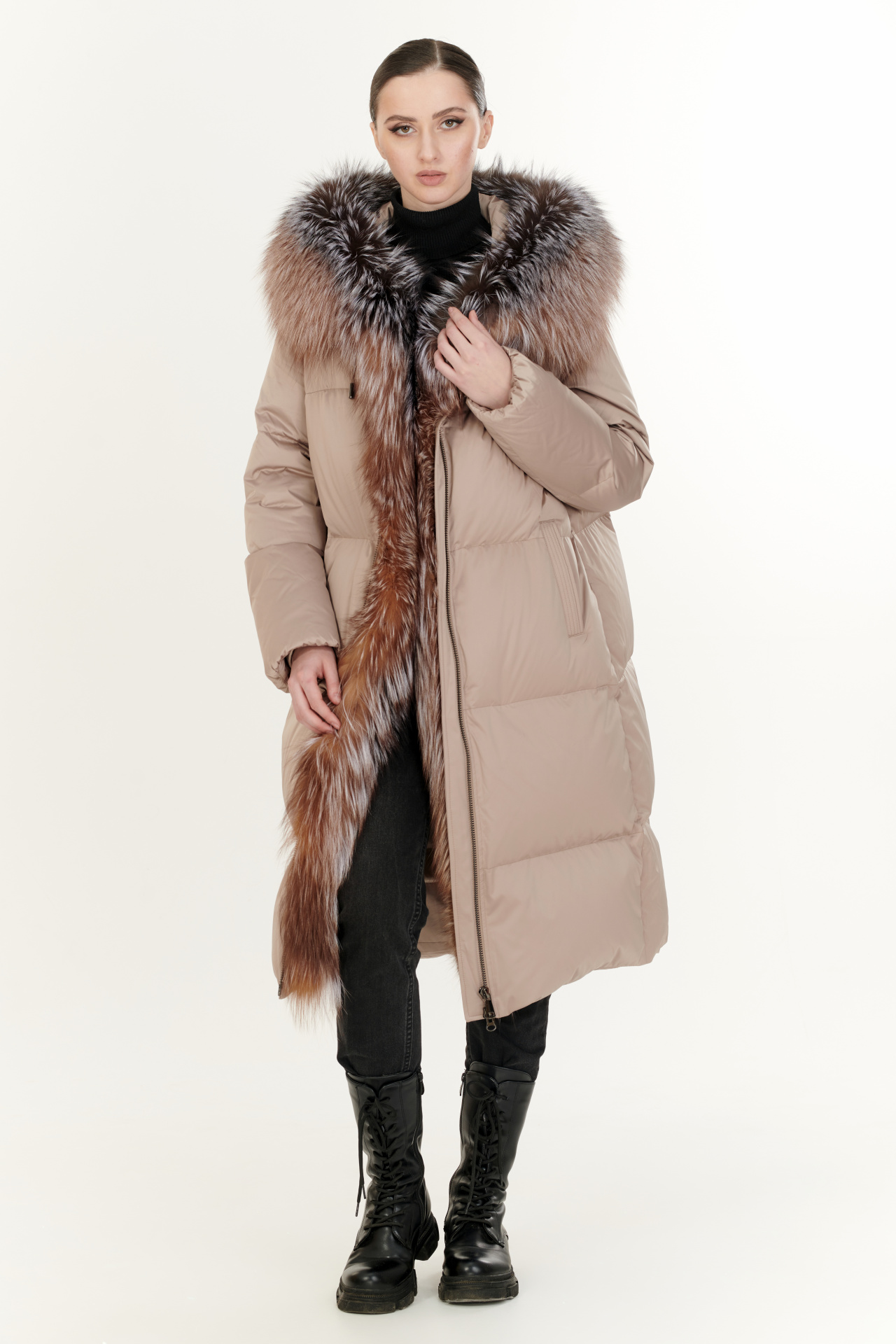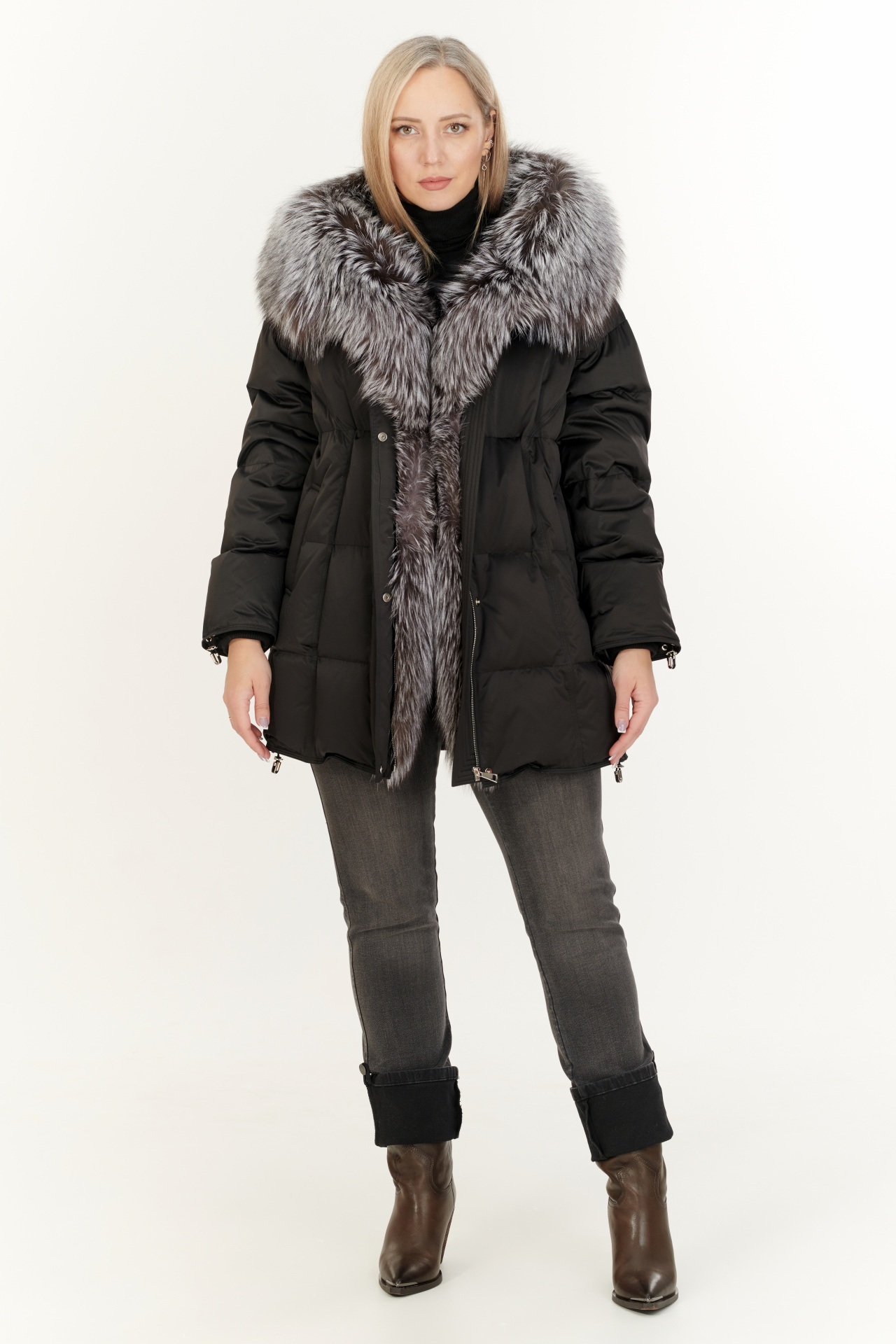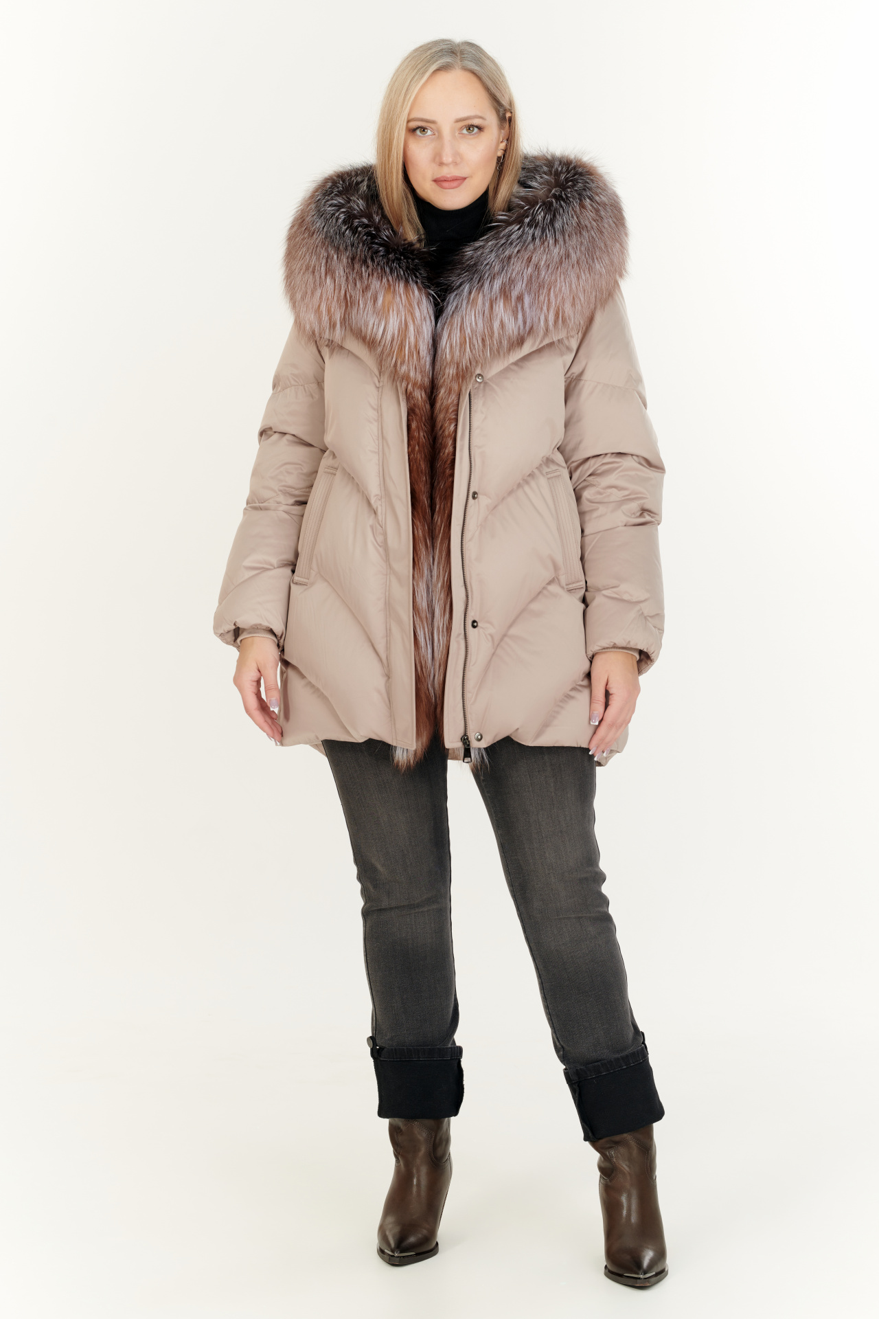 Утепленный тинсулейтом пуховик в тёмно-коричневом цвете. Модель прямого силуэта с капюшоном и поясом, прорезными карманами, застежкой на молнию и планку с кнопками. Отделка экомех