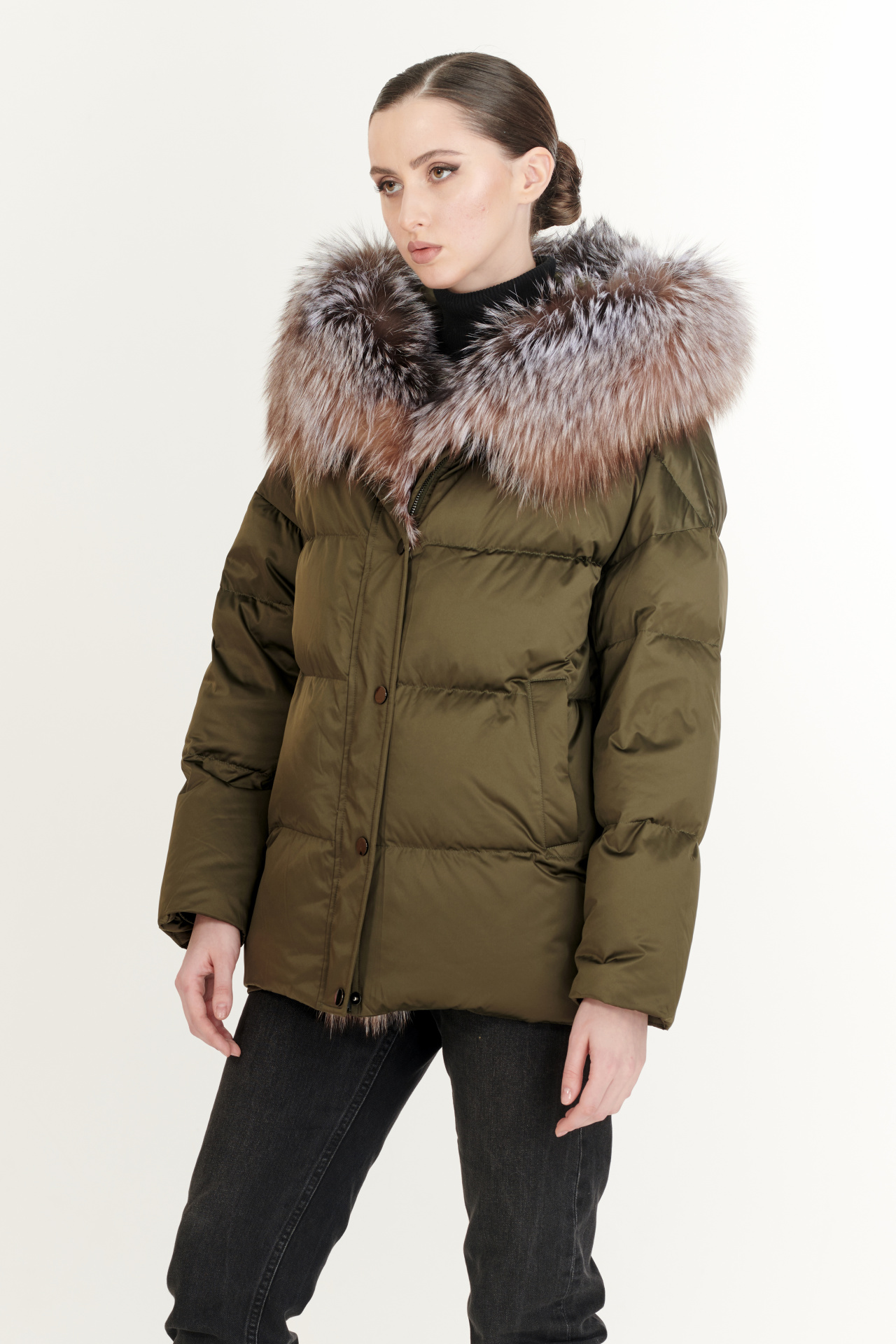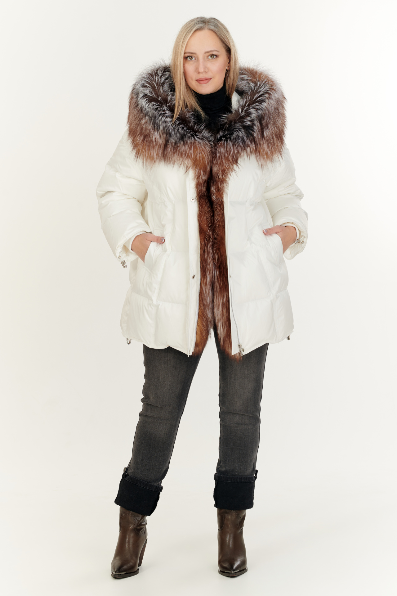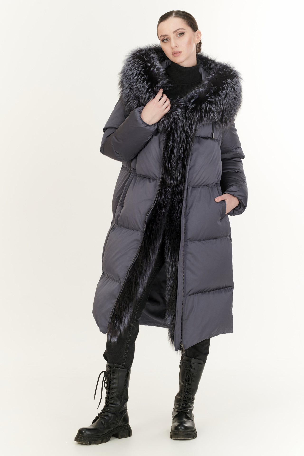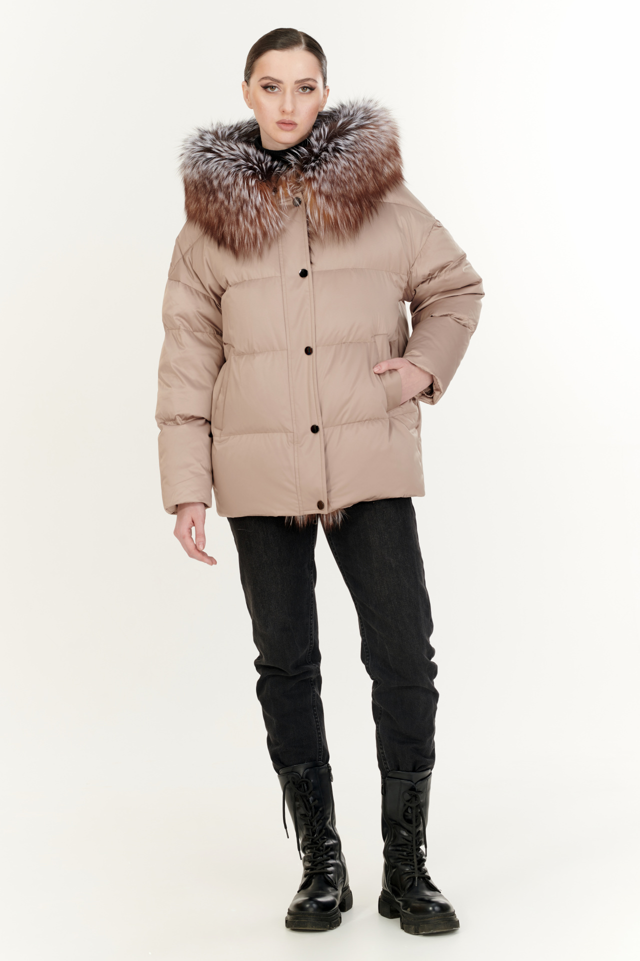 Утепленный тинсулейтом пуховик в тёмно-коричневом цвете. Модель прямого силуэта с капюшоном и поясом, прорезными карманами, застежкой на молнию и планку с кнопками. Отделка экомех