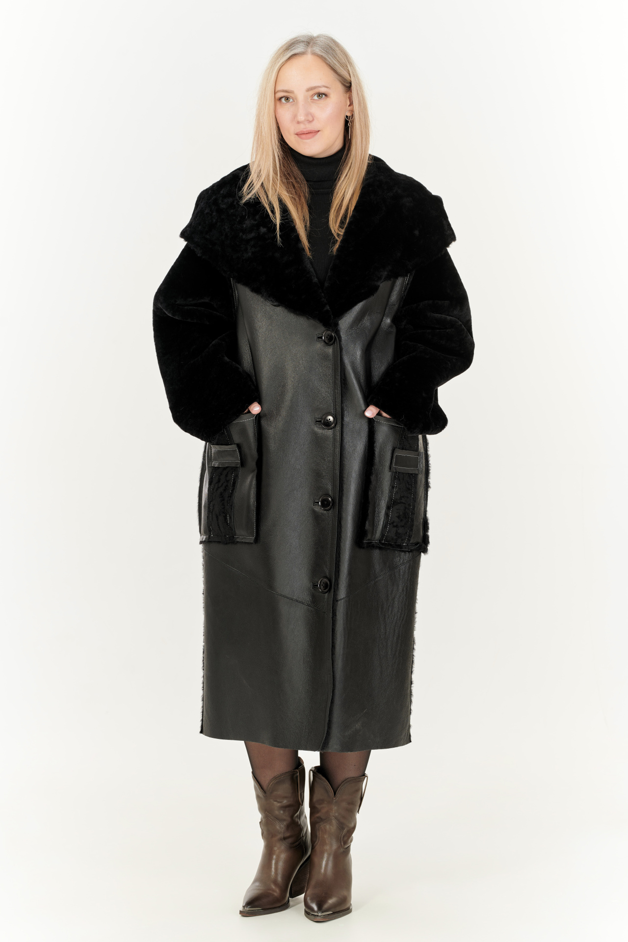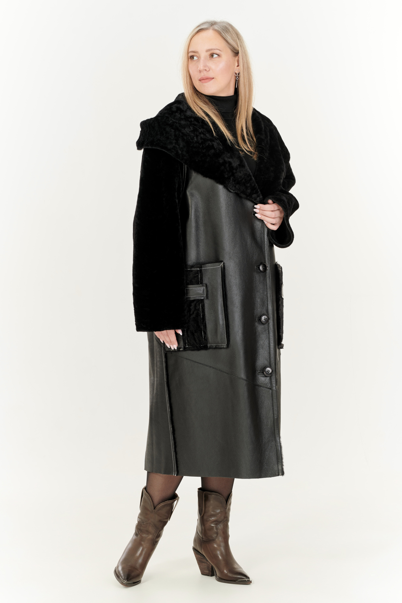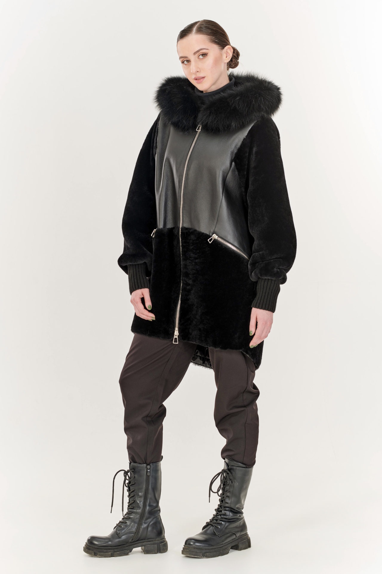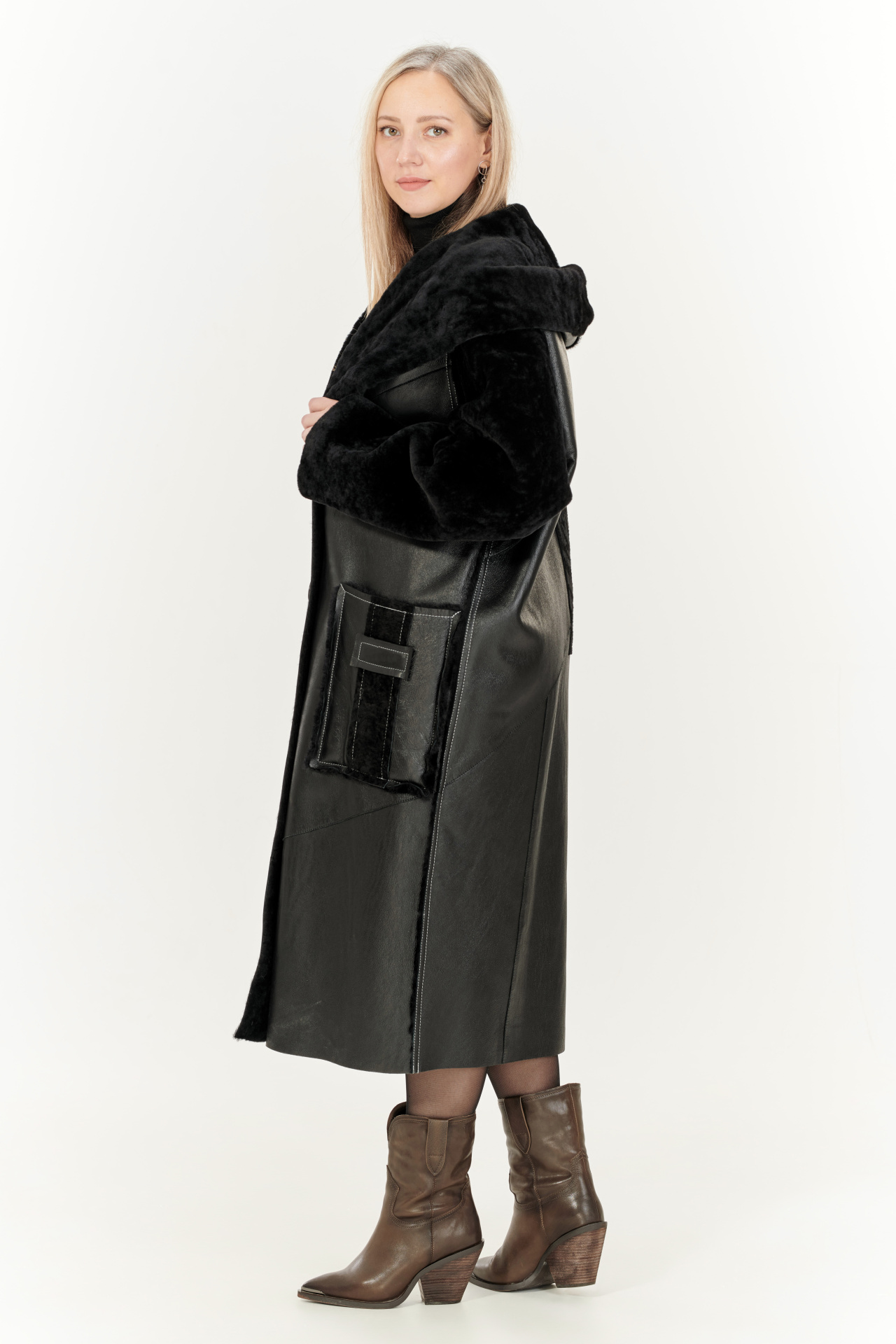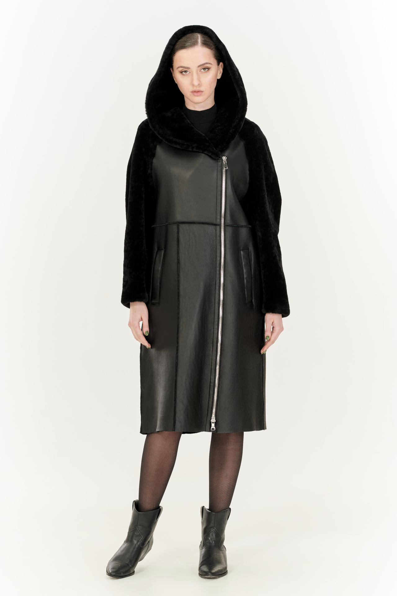 Комбинированная дубленка из овчины и натуральной кожи в черном цвете. Модель прямого силуэта с капюшоном, прорезными карманами и застежкой на пуговицы.
