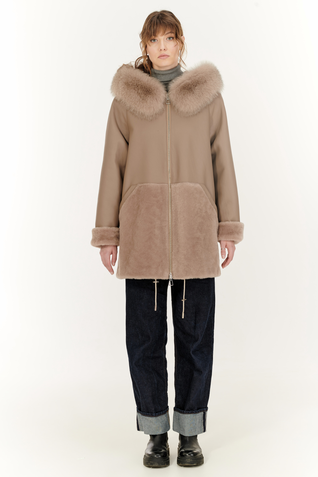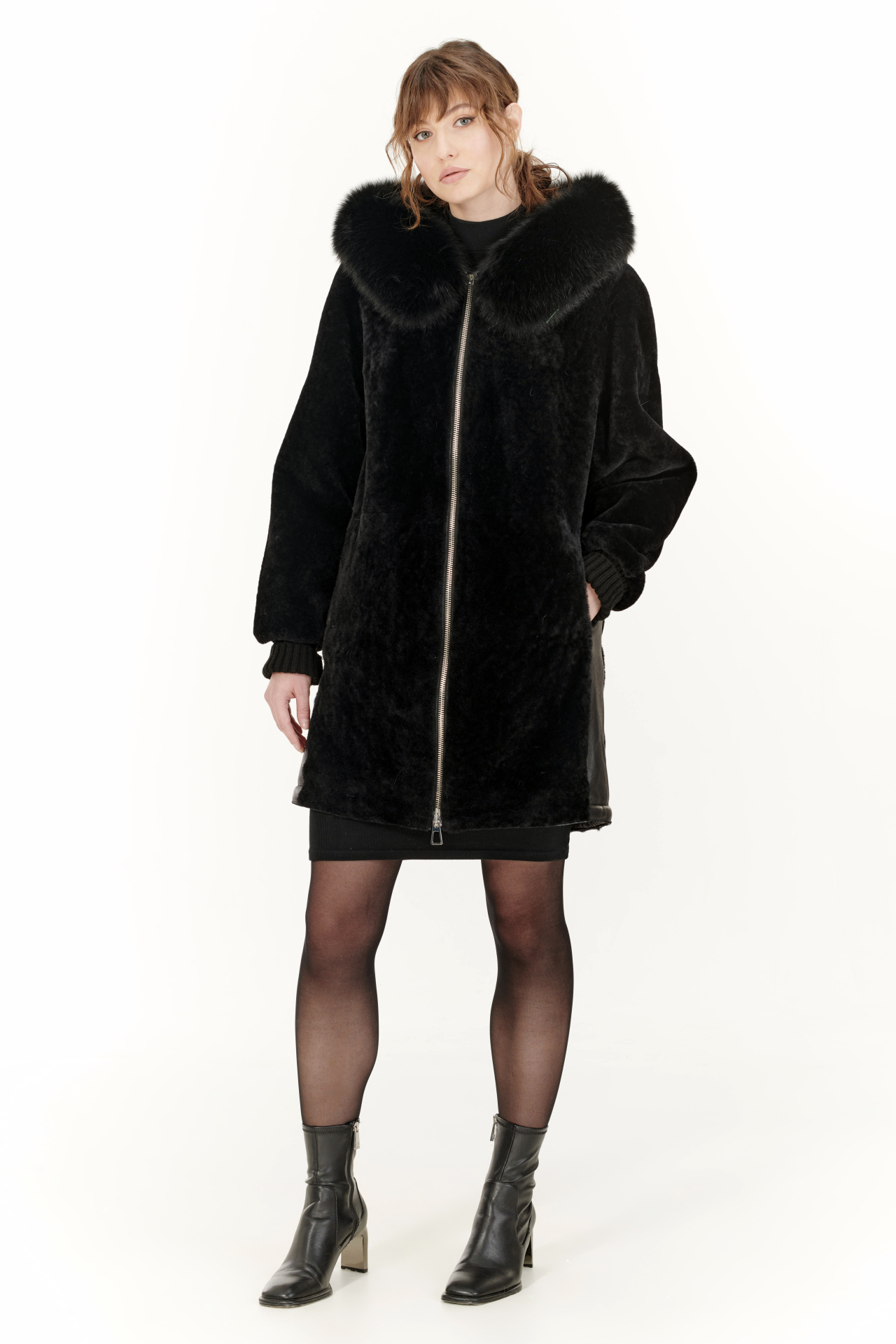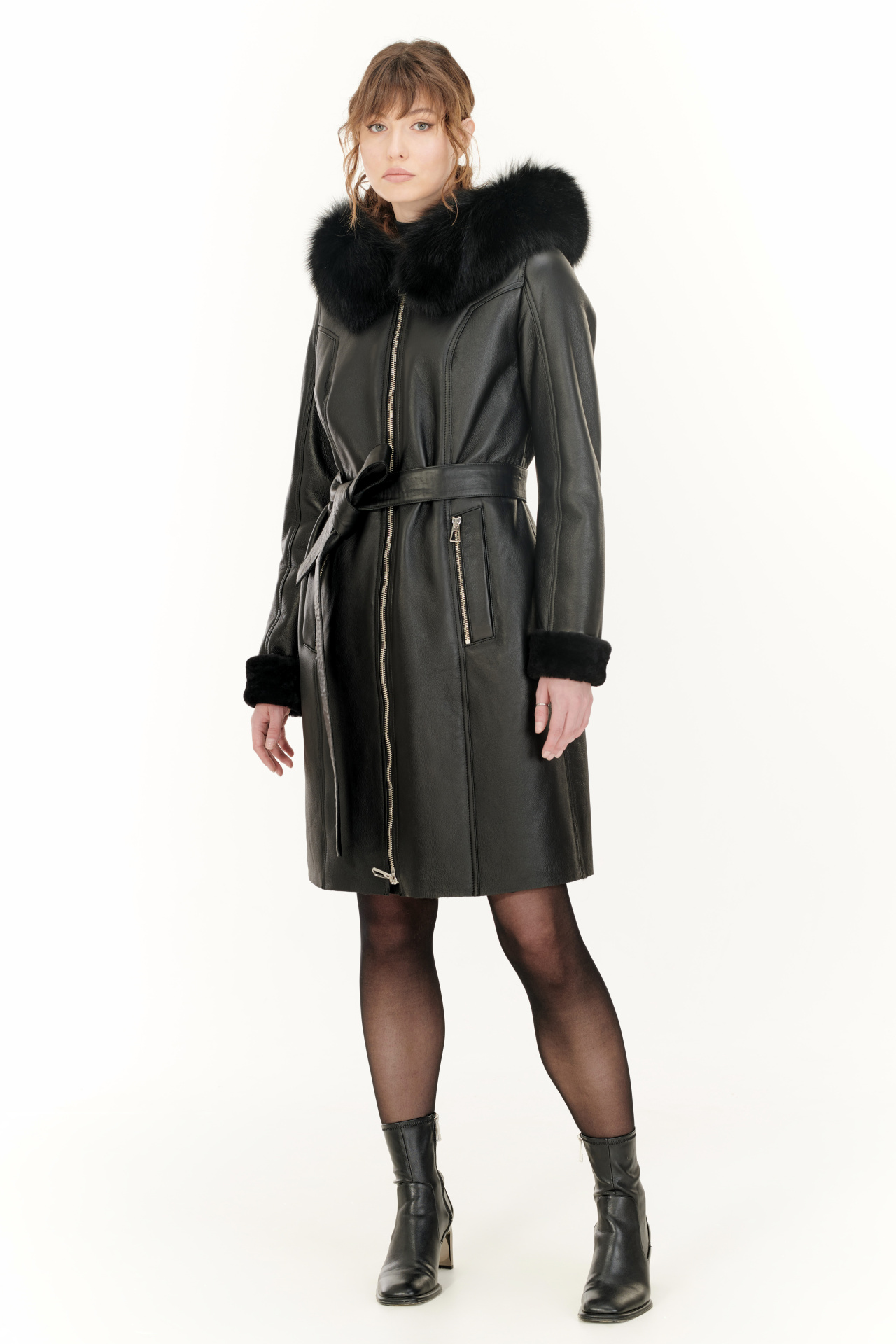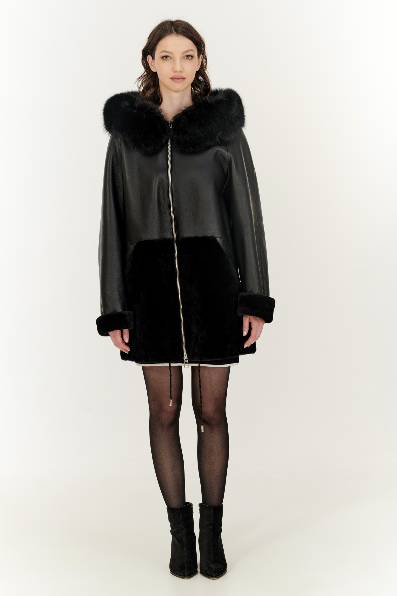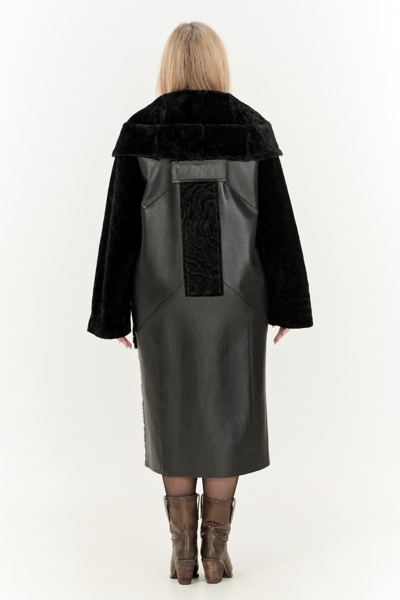 Комбинированная дубленка из овчины и натуральной кожи в черном цвете. Модель прямого силуэта с капюшоном, прорезными карманами и застежкой на пуговицы.
