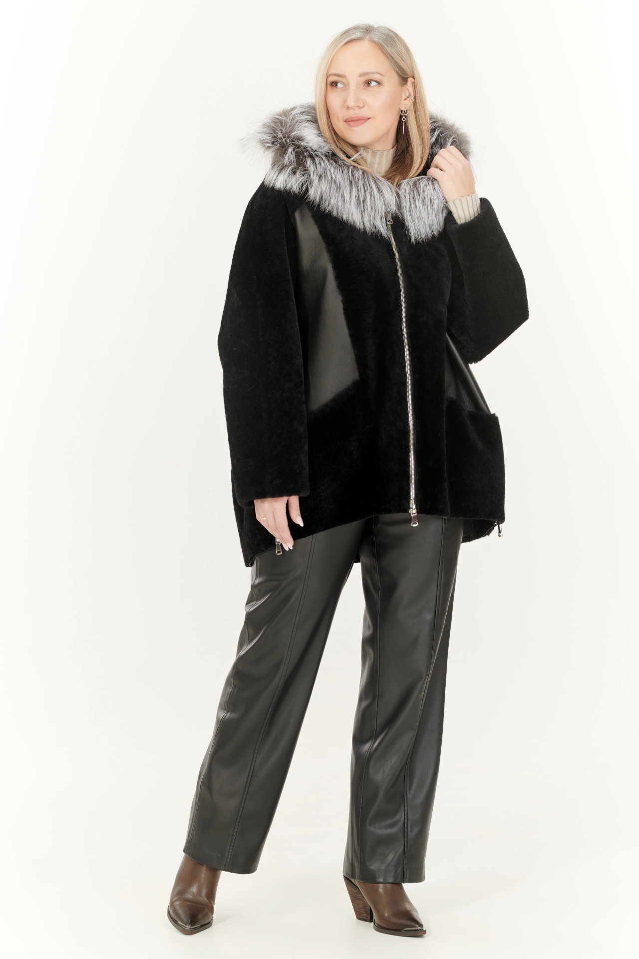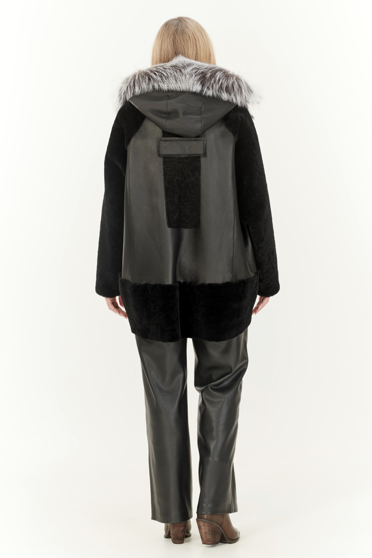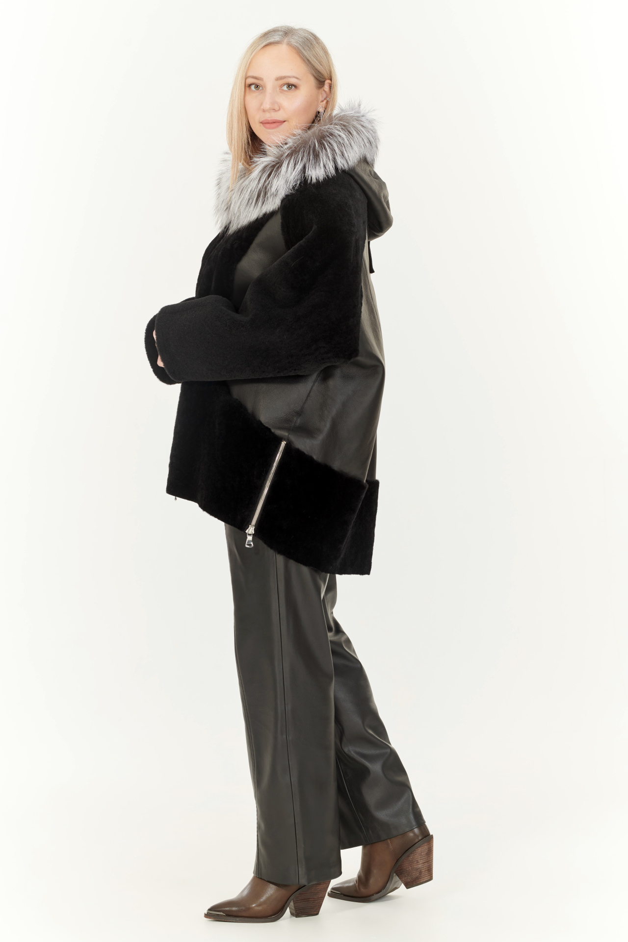 Стильная комбинированная дубленка из овчины и натуральной кожи в черном цвете. Модель силуэта оверсайз с прорезными карманами и застежкой на молнию. Капюшон с мехом чернобурой лисицы.