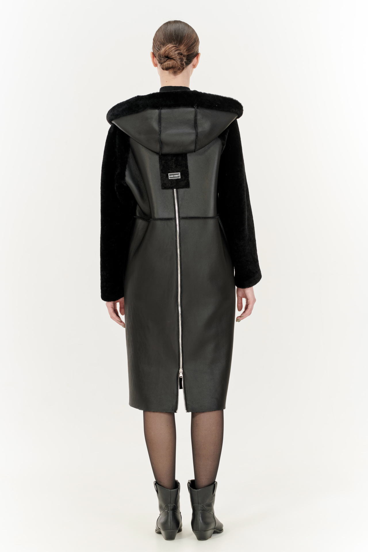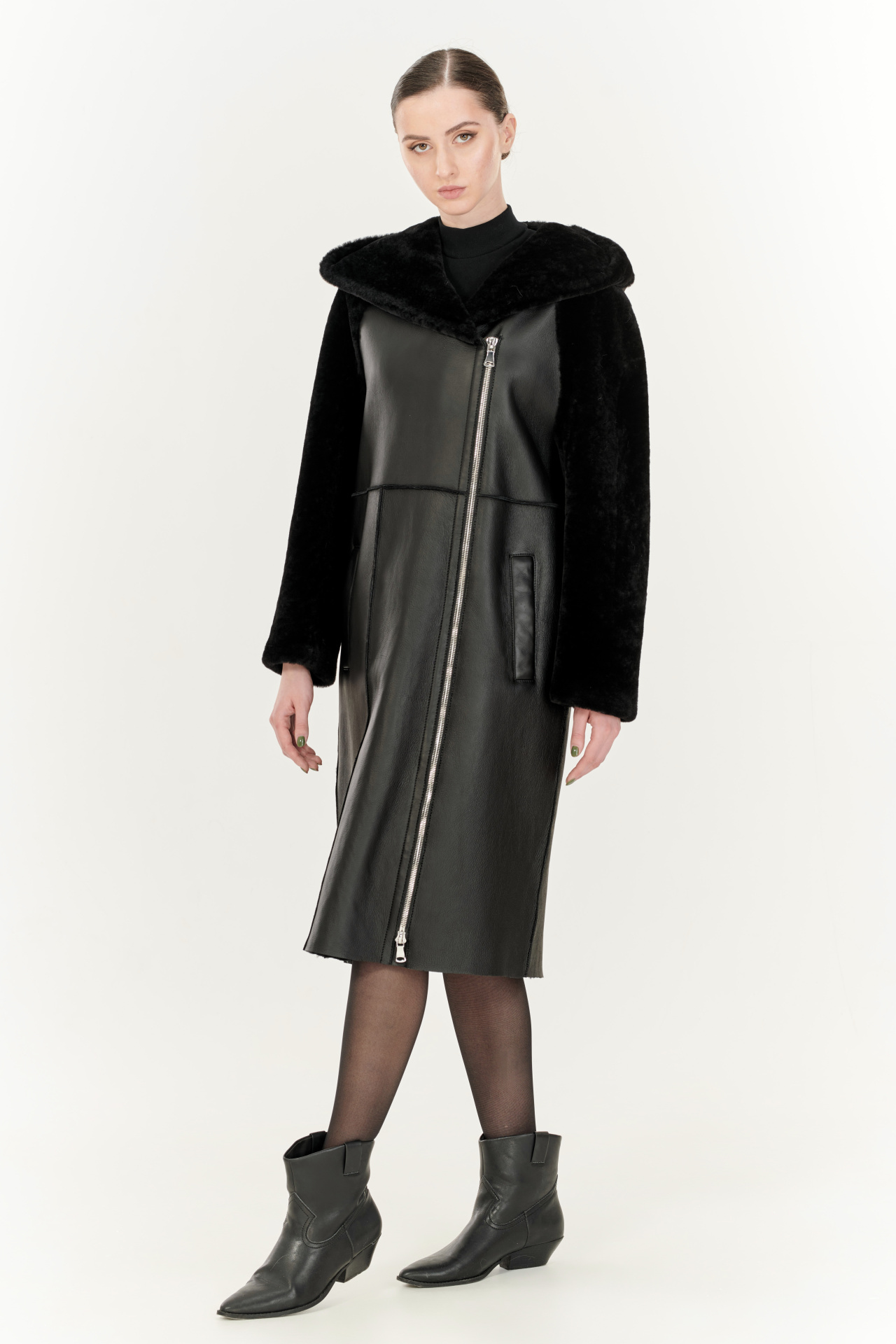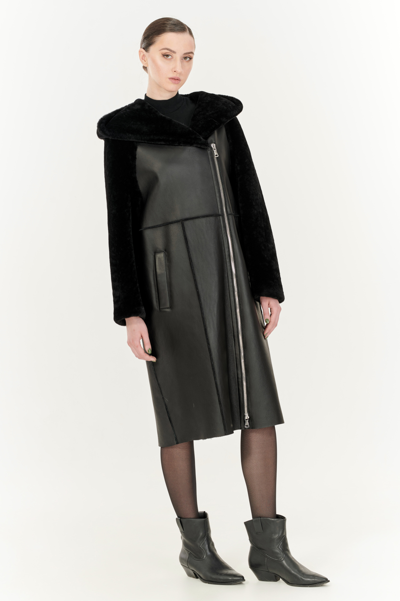 Комбинированная дубленка из овчины и натуральной кожи в черном цвете. Модель прямого силуэта с капюшоном, прорезными карманами и застежкой на молнию.