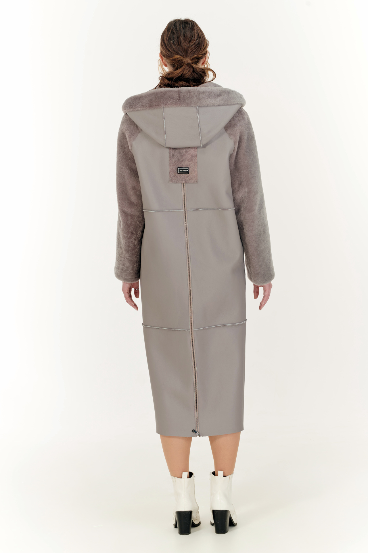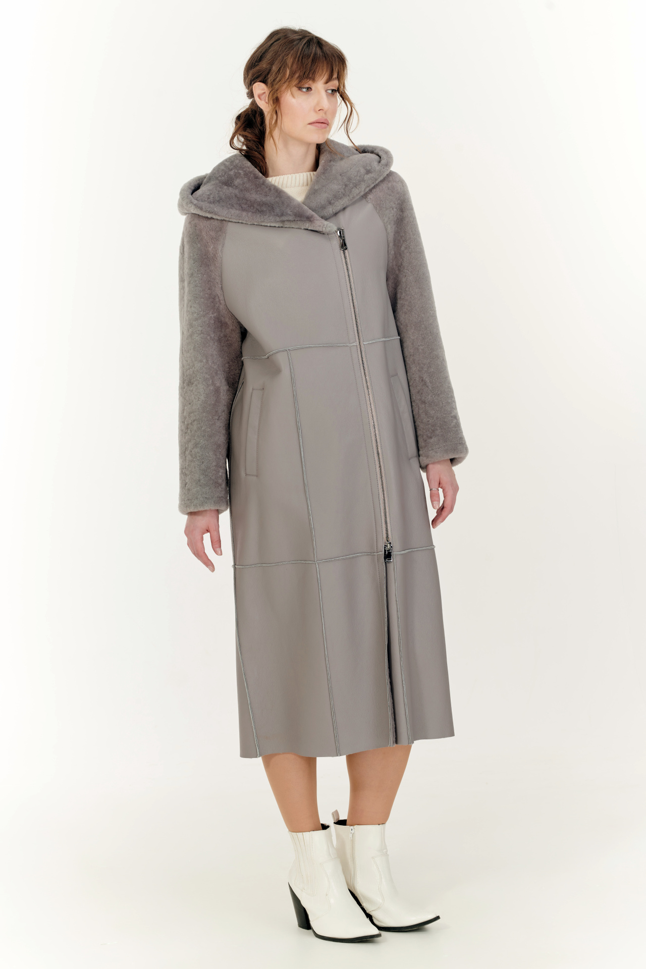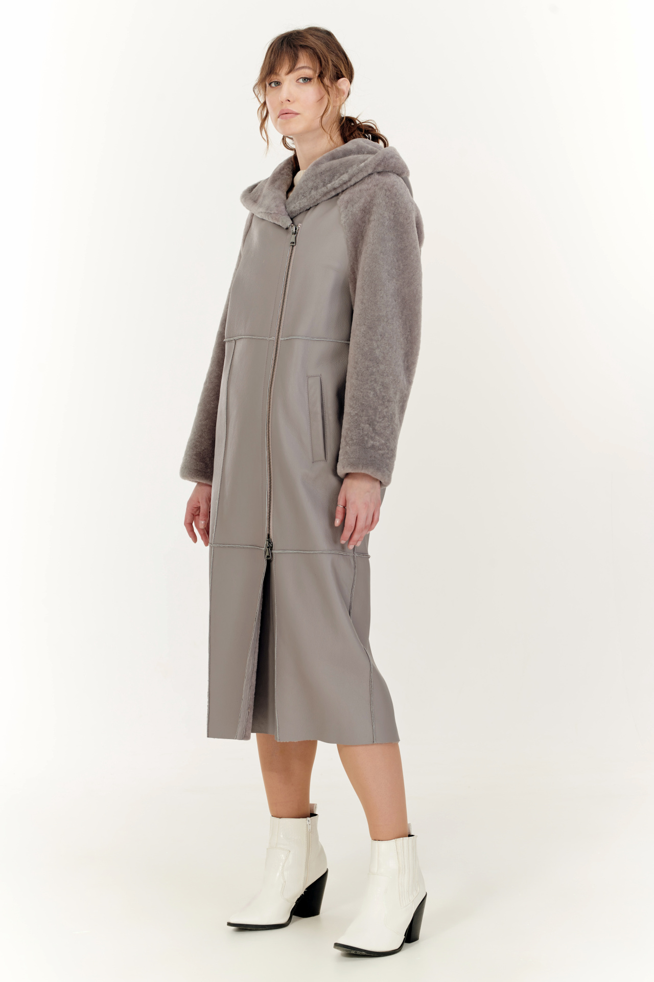 Комбинированная дубленка из овчины и натуральной кожи в сером цвете. Модель прямого силуэта с капюшоном, прорезными карманами и застежкой на молнию.