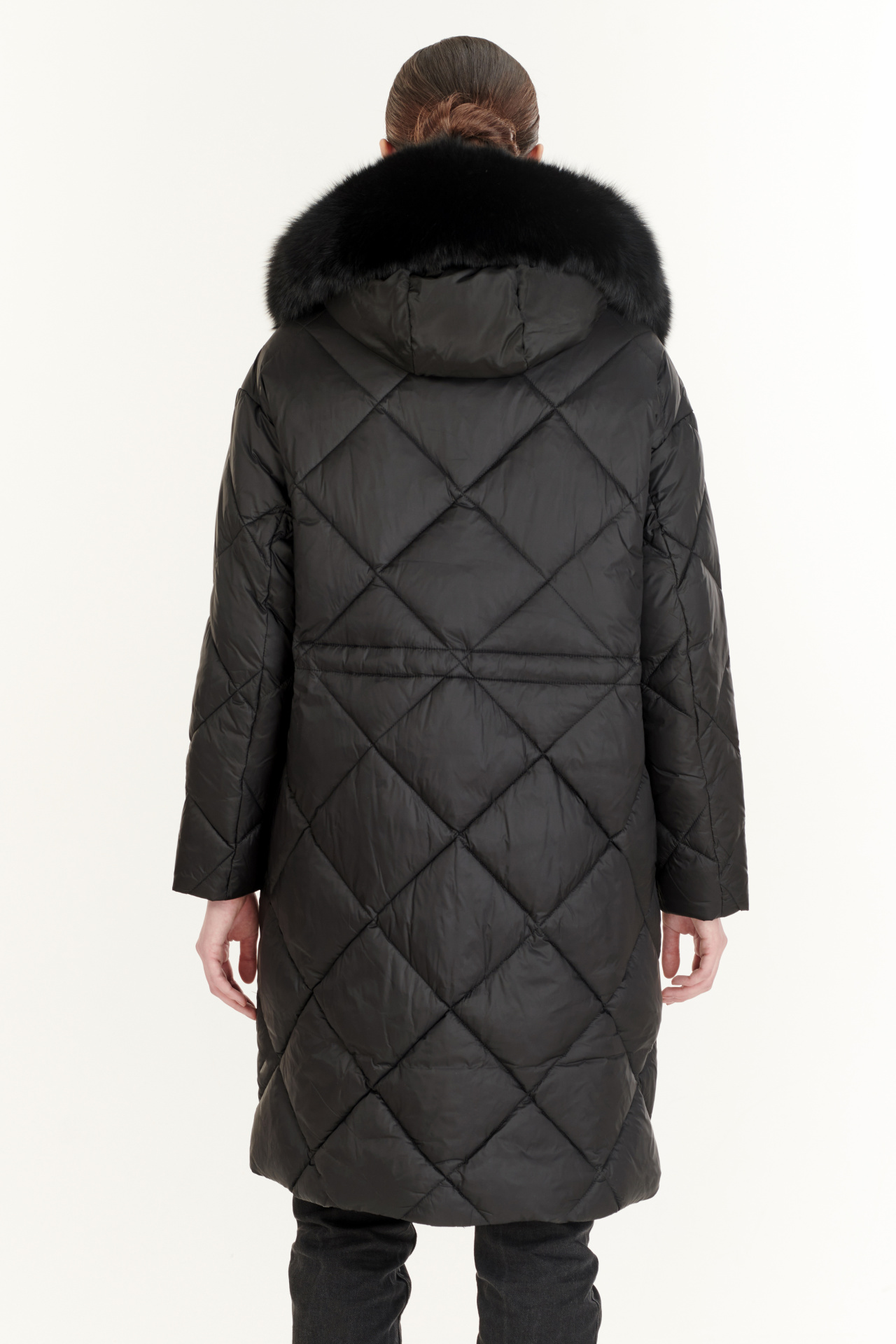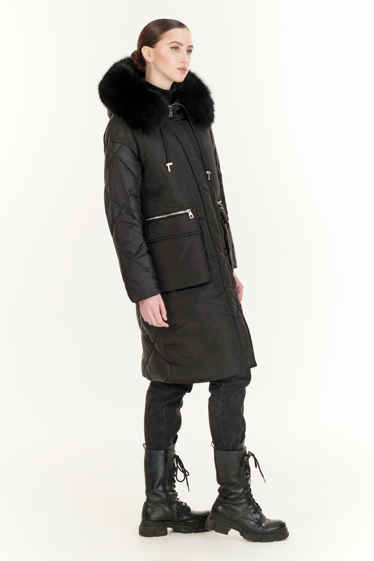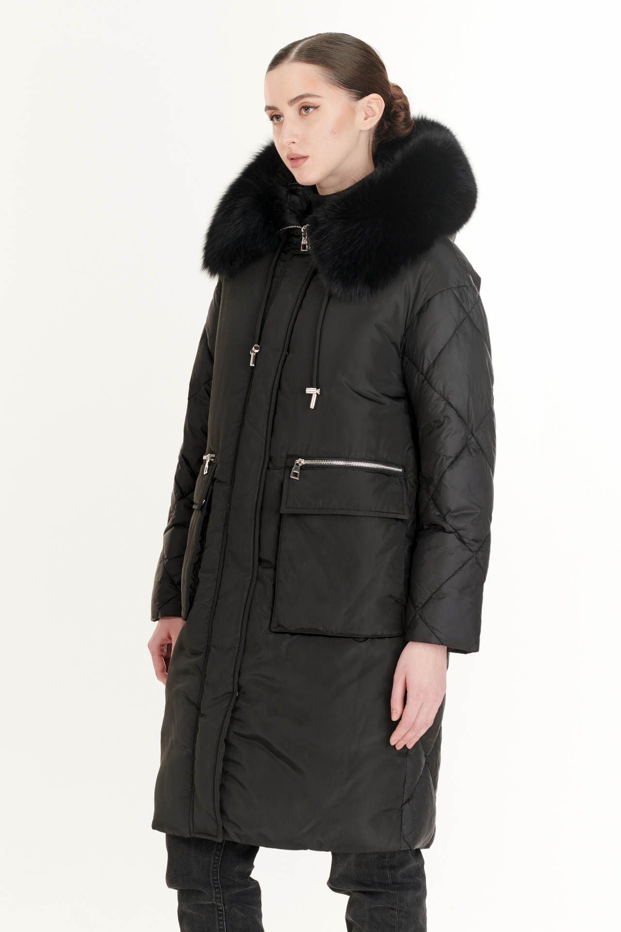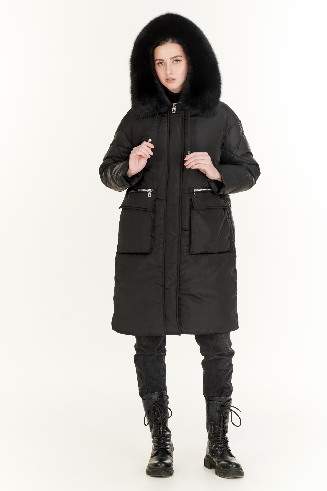 Утепленный пуховик в черном цвете. Модель прямого силуэта с капюшоном, накладными карманами, застежкой на молнию и планку с кнопками. Отделка экомех.