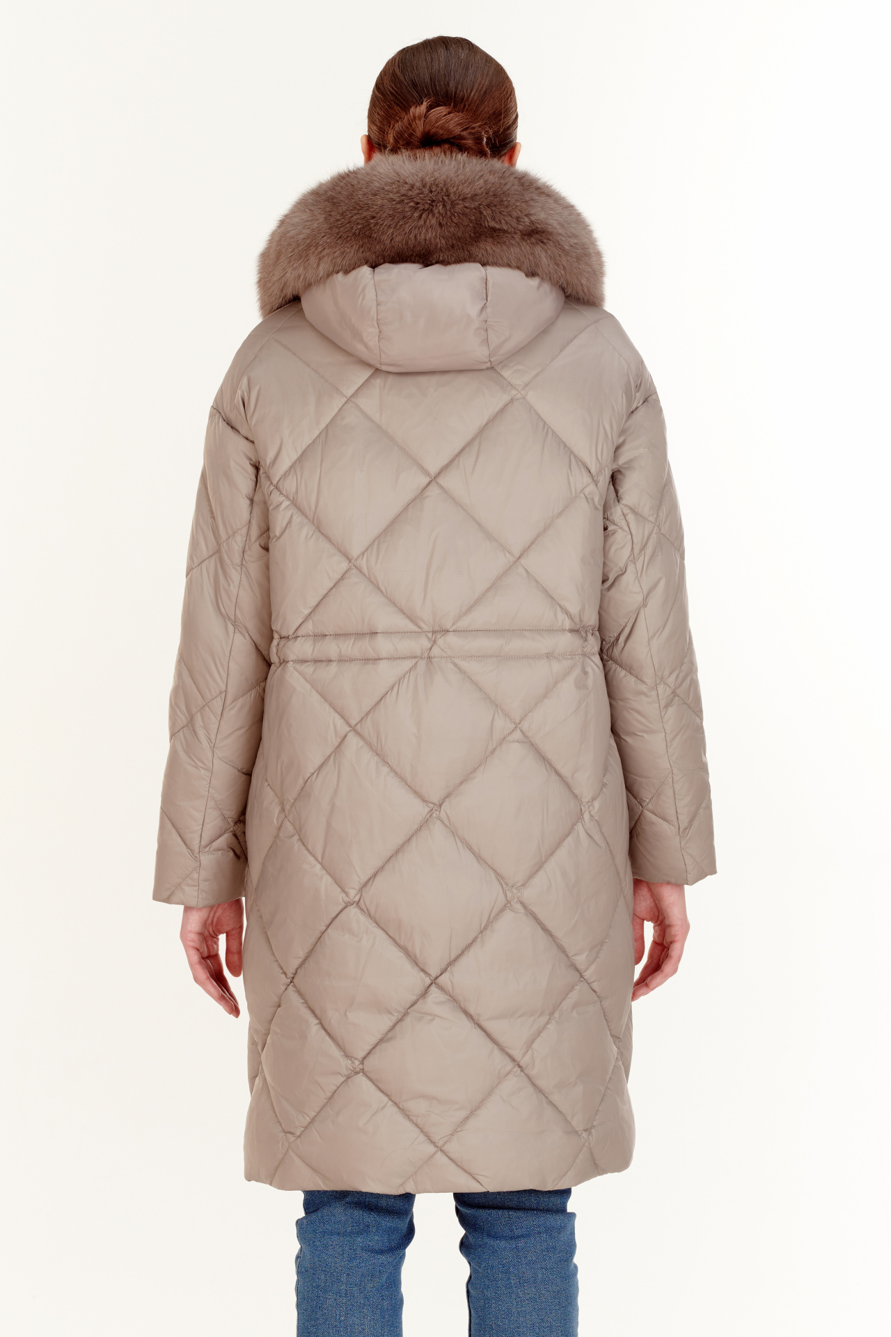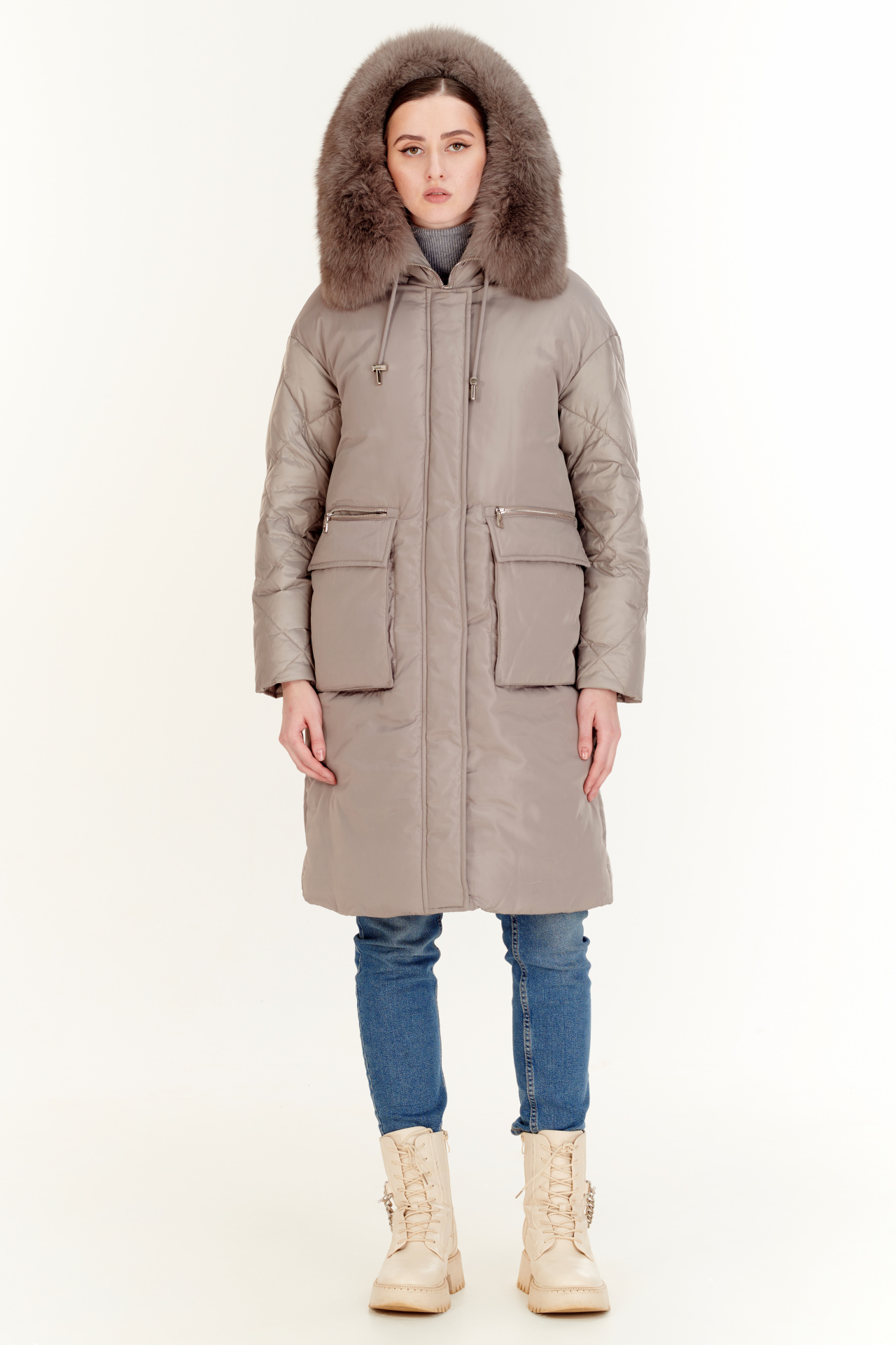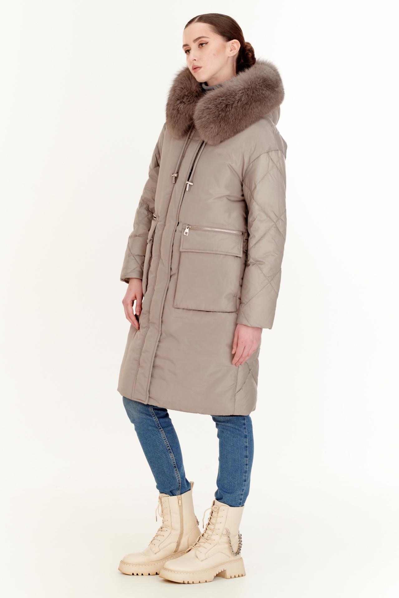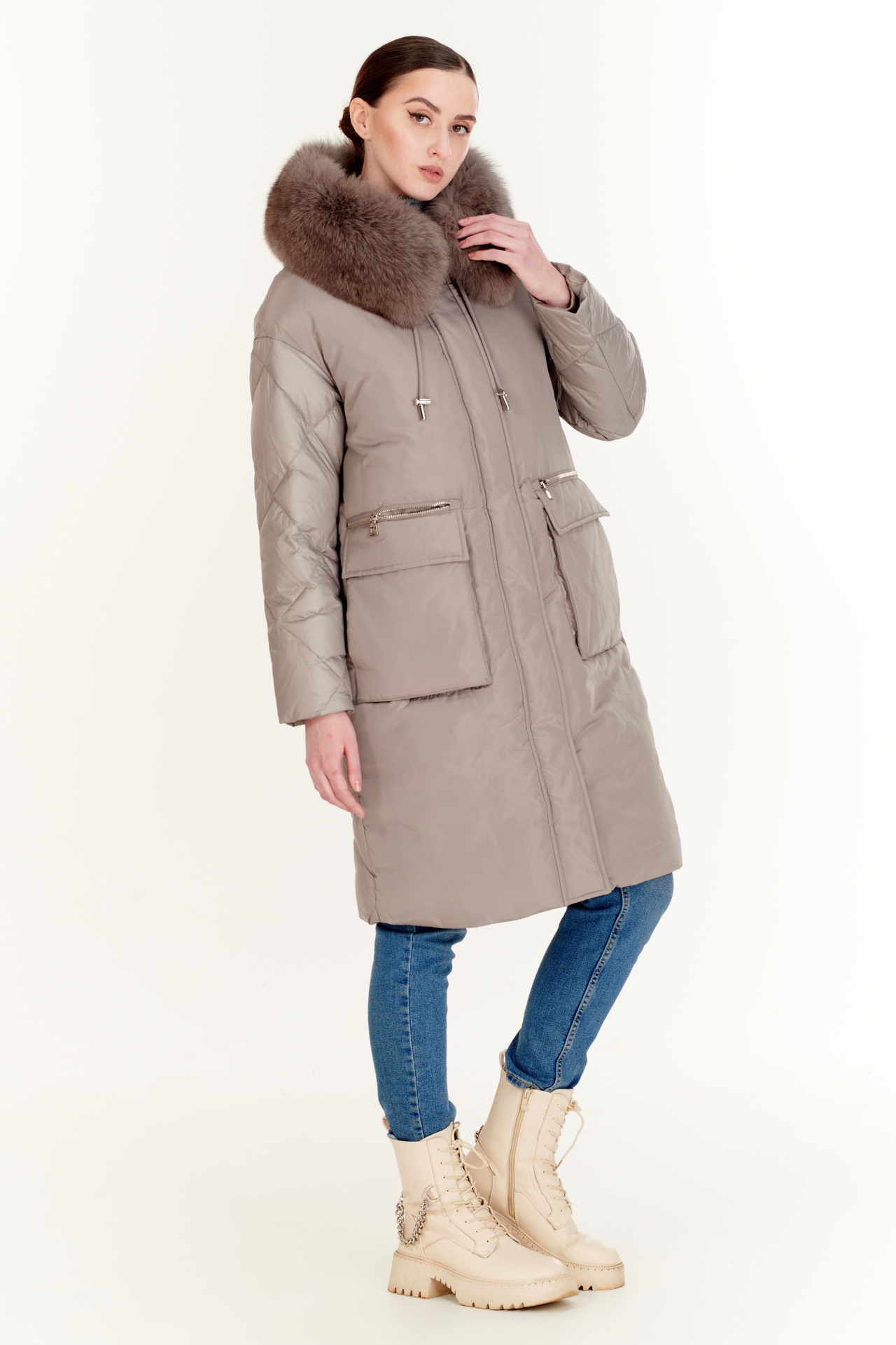 Утепленный пуховик в сером цвете. Модель прямого силуэта с меховым капюшоном, накладными карманами, застежкой на молнию и планку с кнопками. Отделка натуральный мех песца.