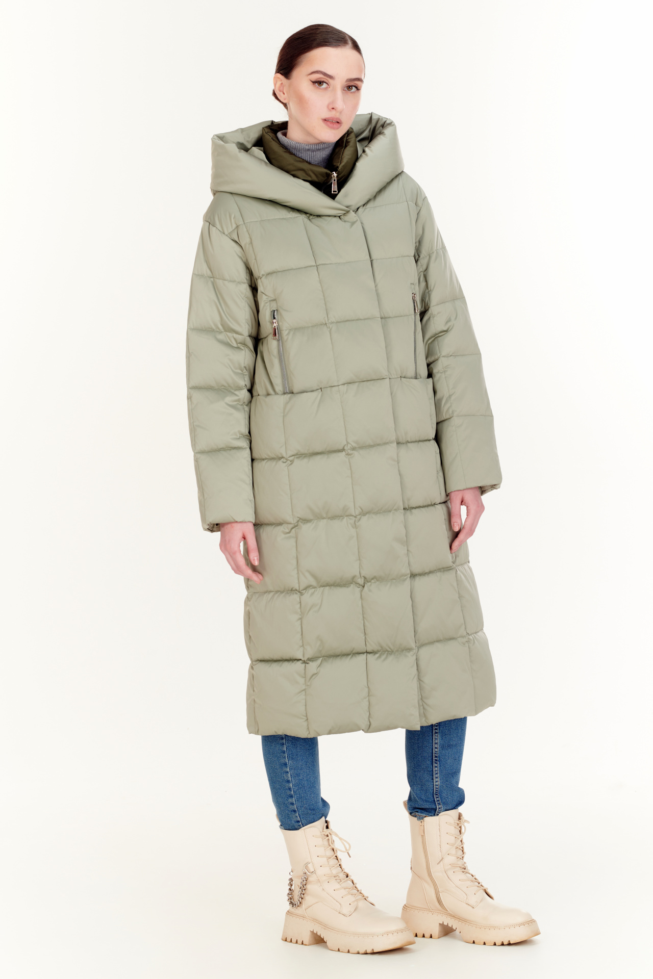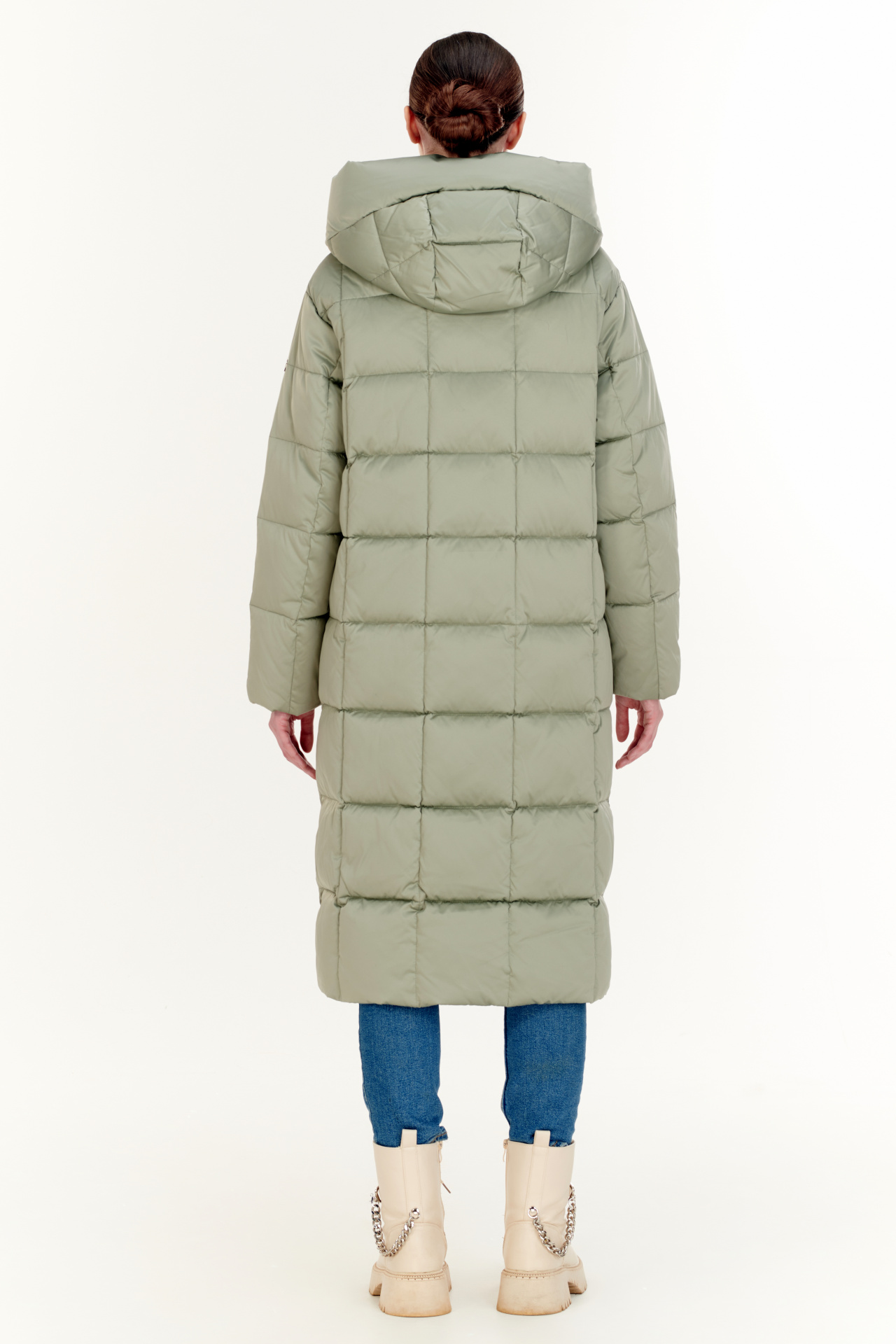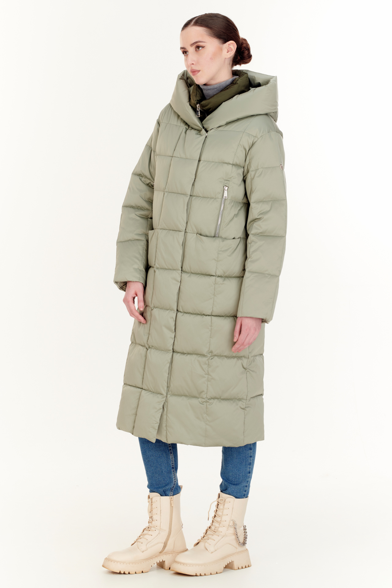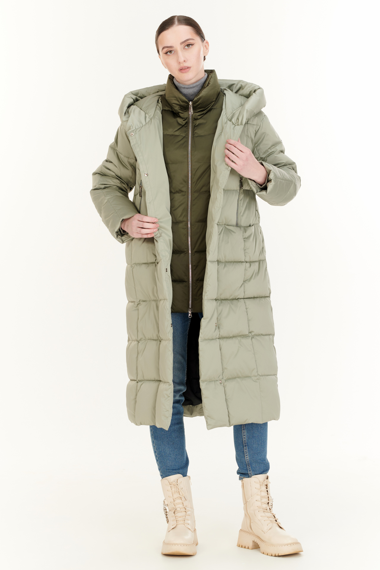 Утепленный пуховик в светло-зеленом цвете. Модель прямого силуэта с капюшоном, прорезными карманами, застежкой на молнию и планку с кнопками.