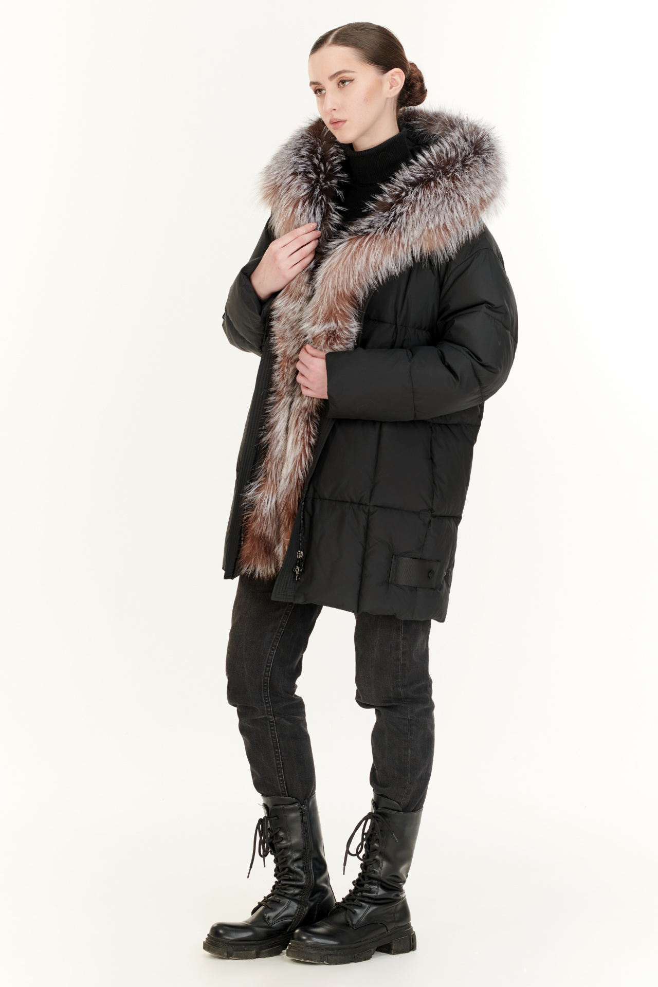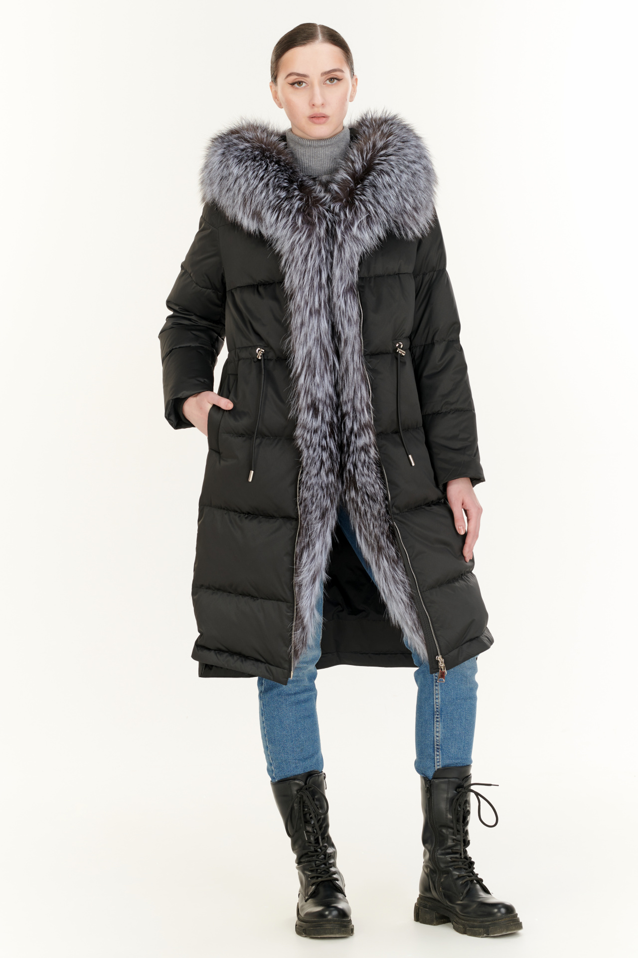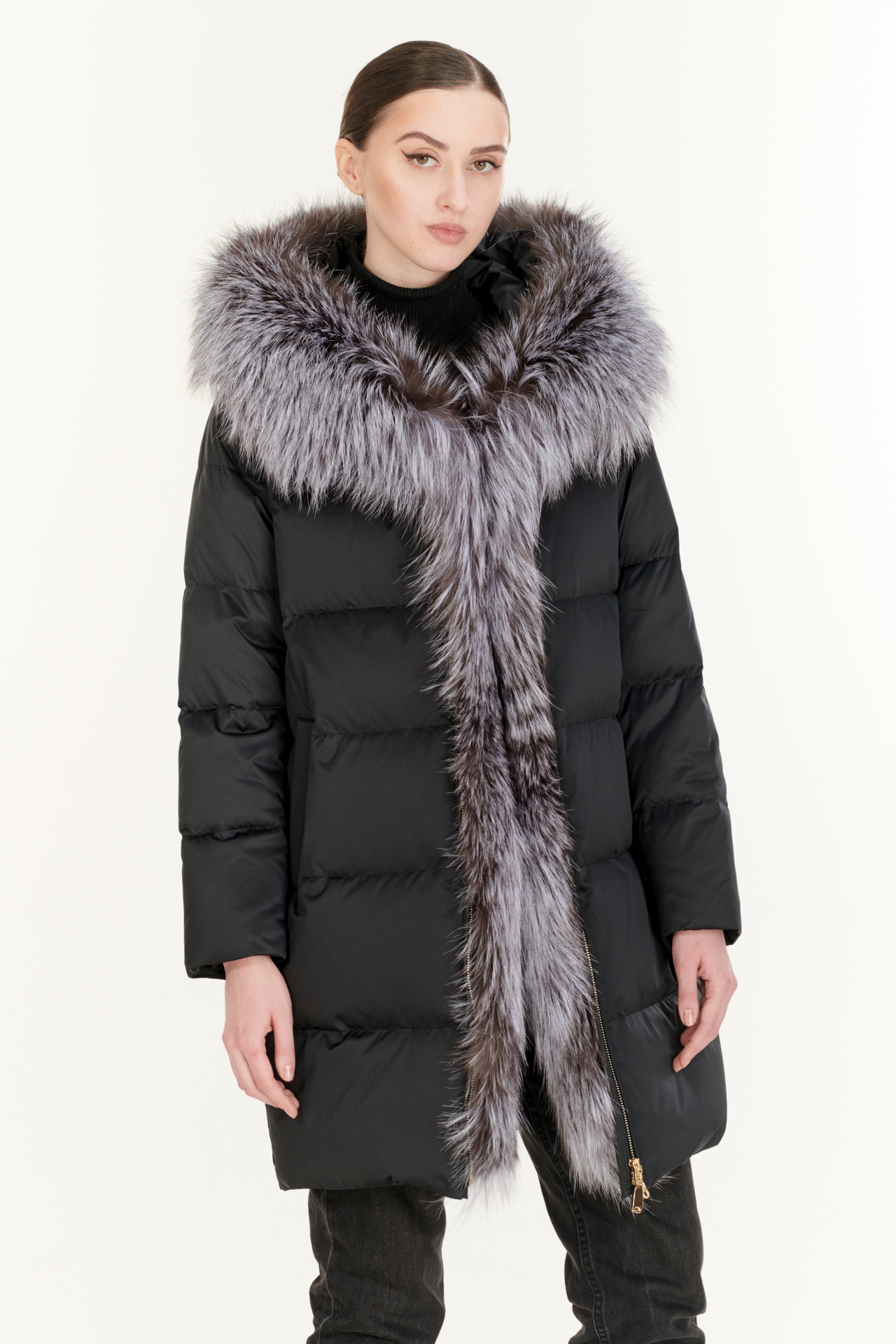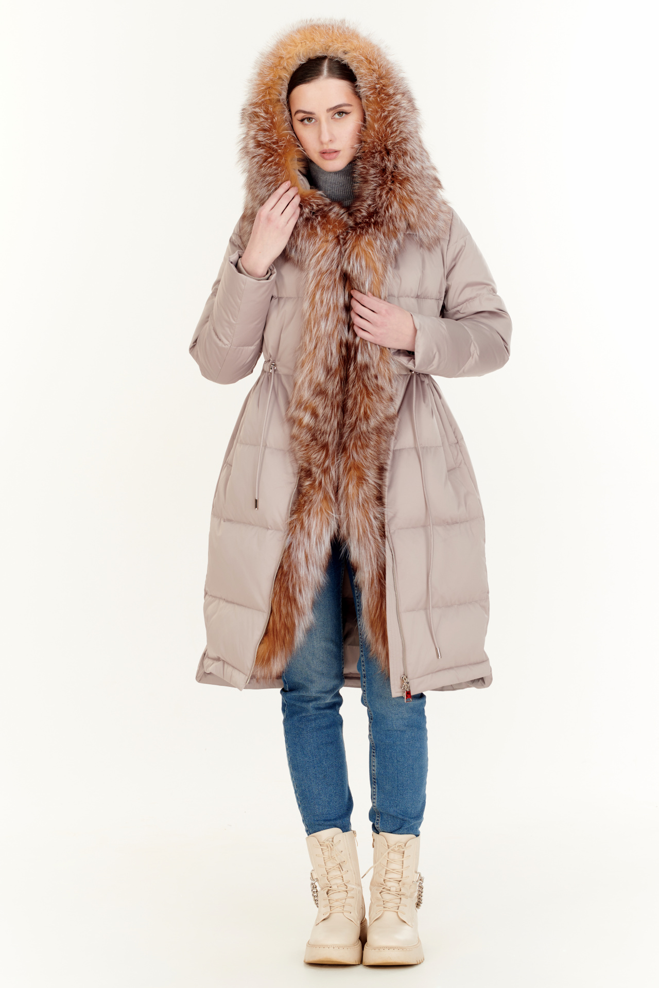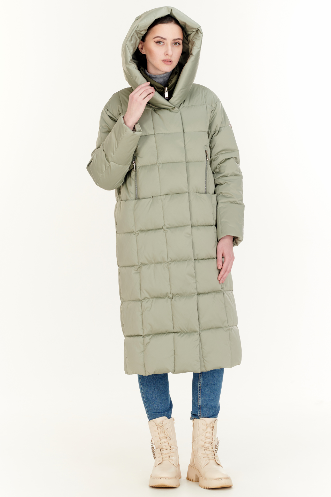 Утепленный пуховик в светло-зеленом цвете. Модель прямого силуэта с капюшоном, прорезными карманами, застежкой на молнию и планку с кнопками.