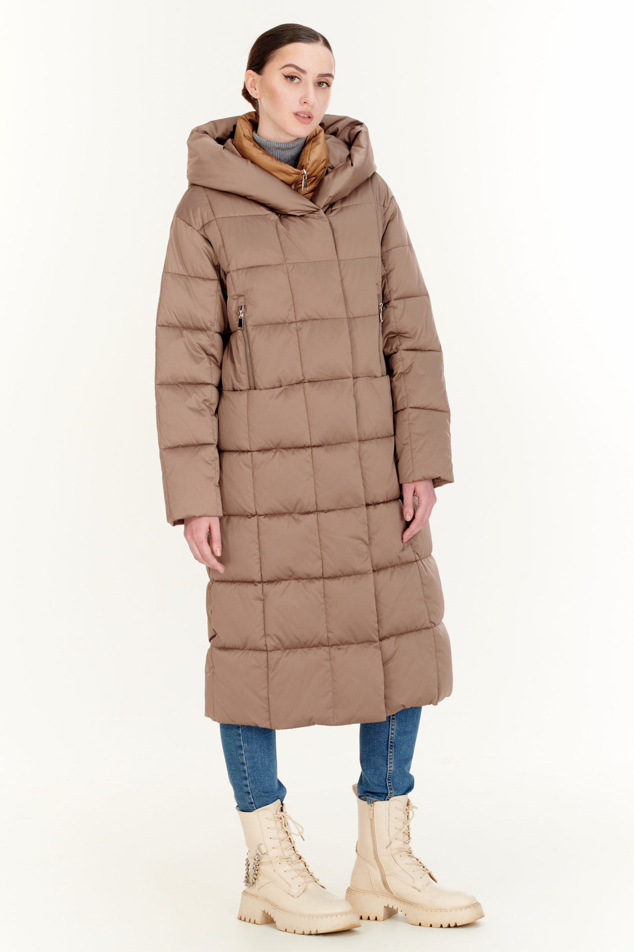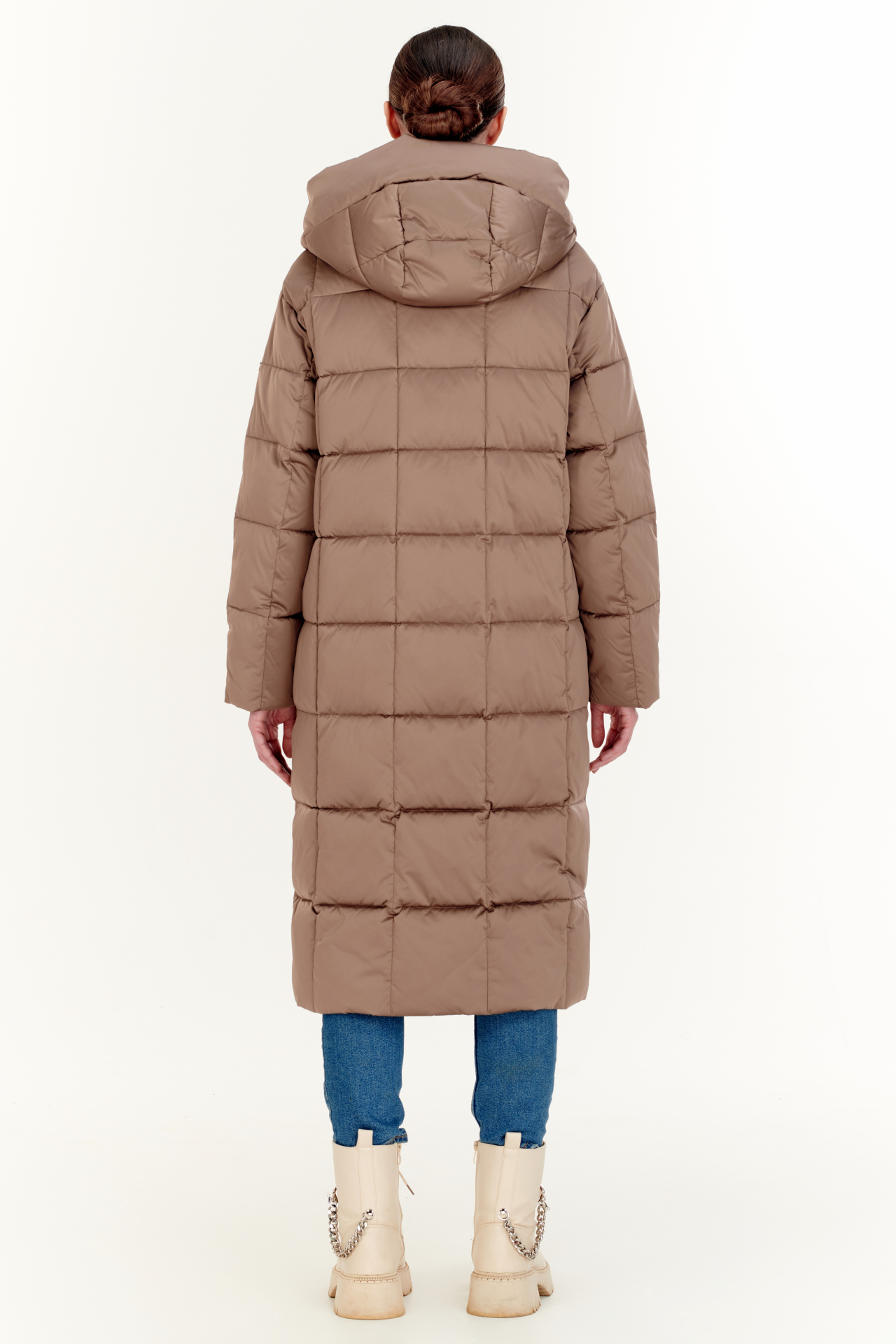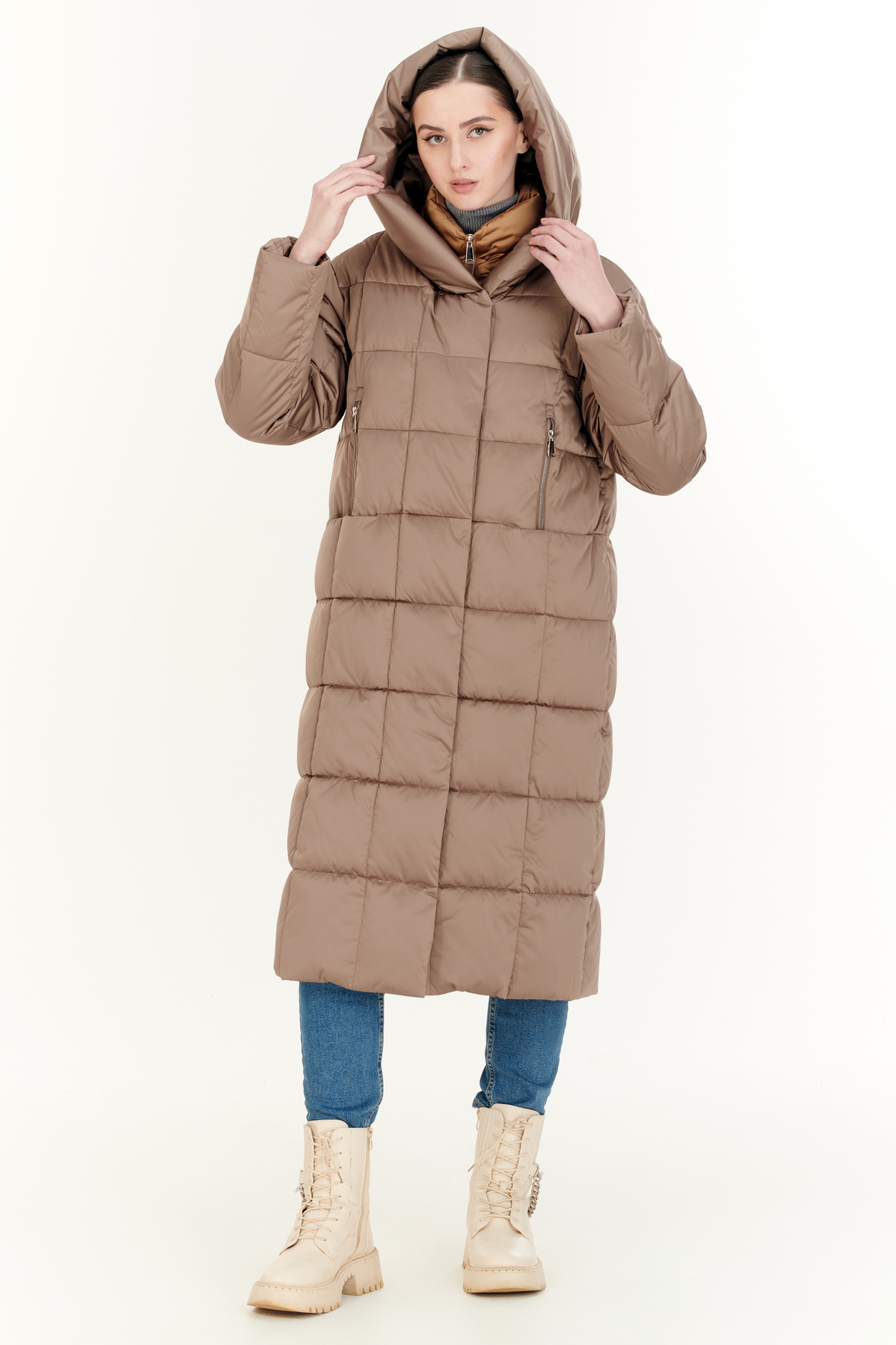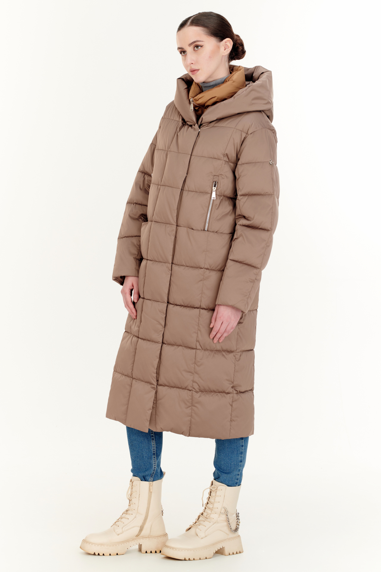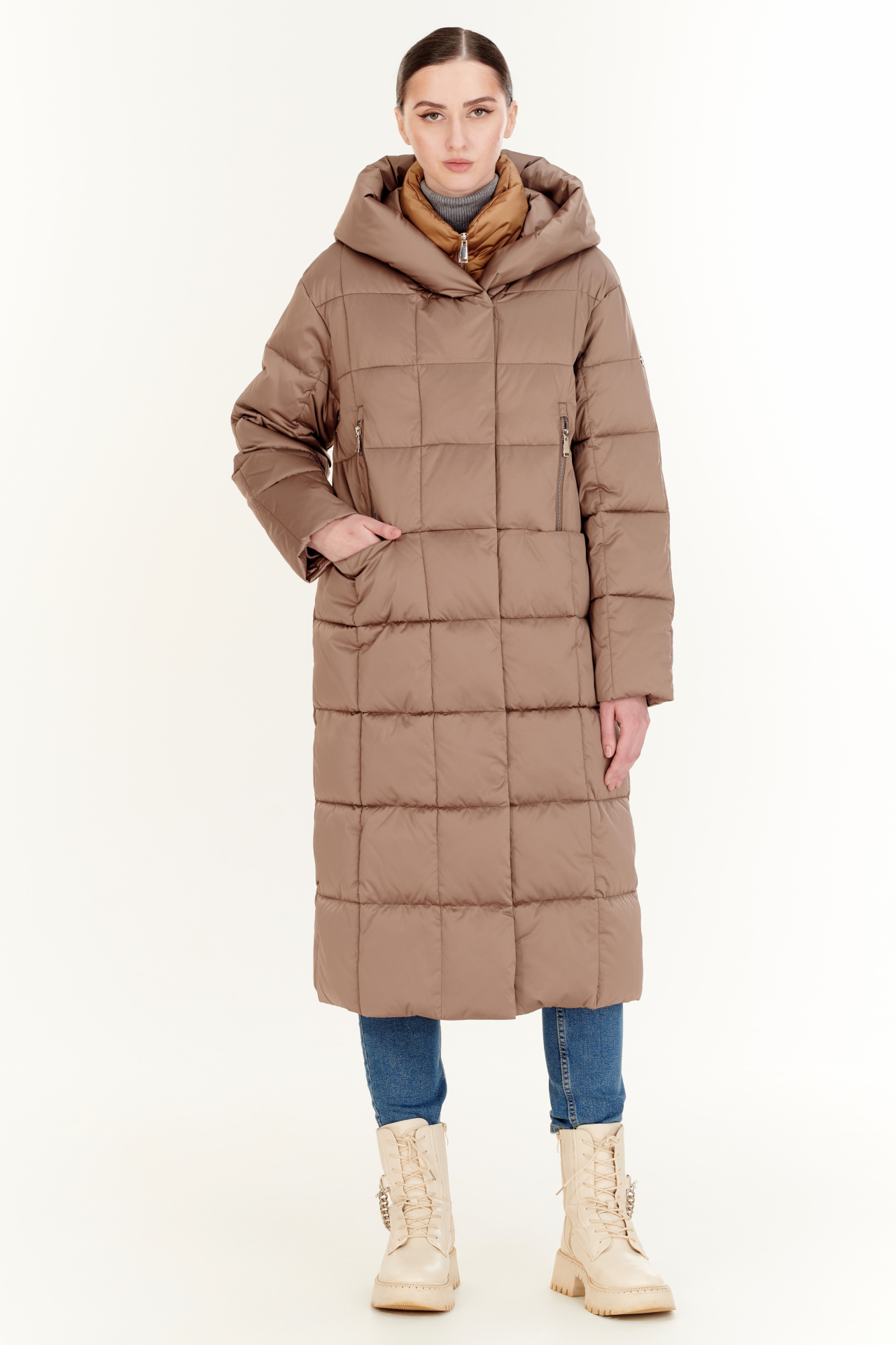 Утепленный пуховик в светло-коричневом цвете. Модель прямого силуэта с капюшоном, прорезными карманами, застежкой на молнию и планку с кнопками.