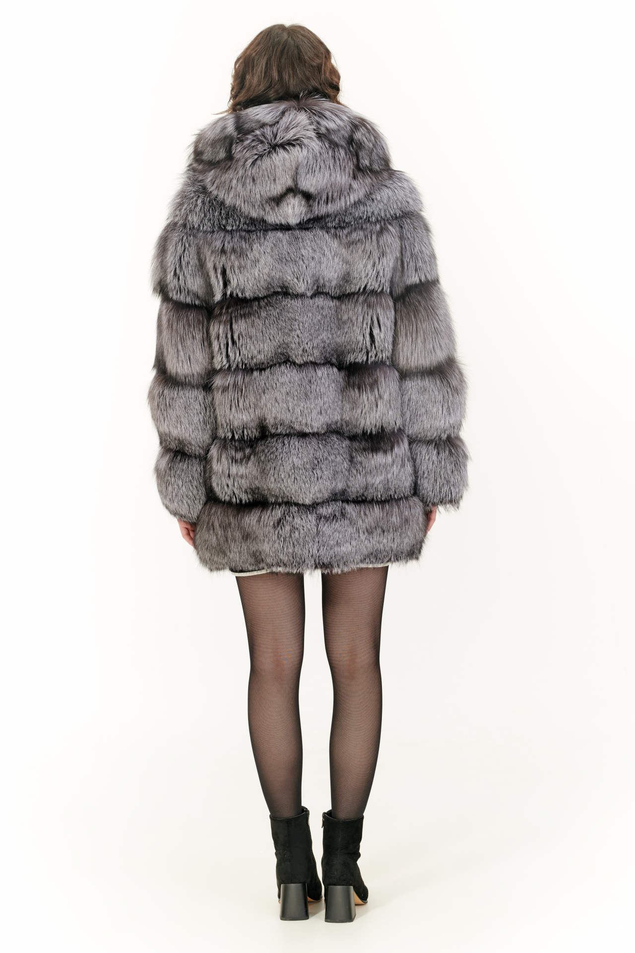 Шуба из натурального меха чернобурой лисицы. Модель прямого силуэта с капюшоном, прорезными карманами и застежкой на шубные крючки.