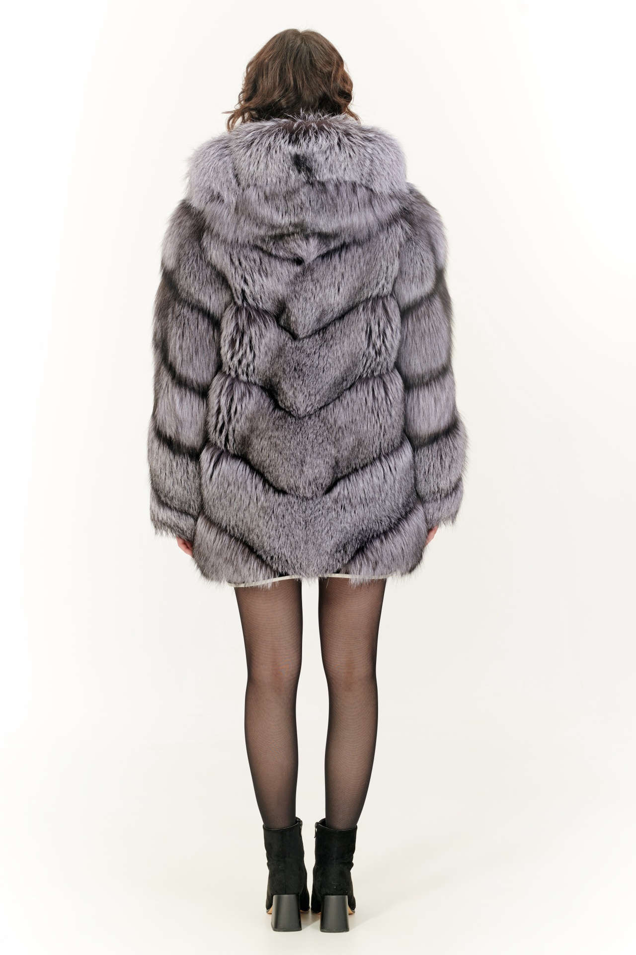 Шуба из натурального меха чернобурой лисицы. Модель прямого силуэта с капюшоном, паркетной раскладкой меха, с прорезными карманами и застежкой на шубные крючки.