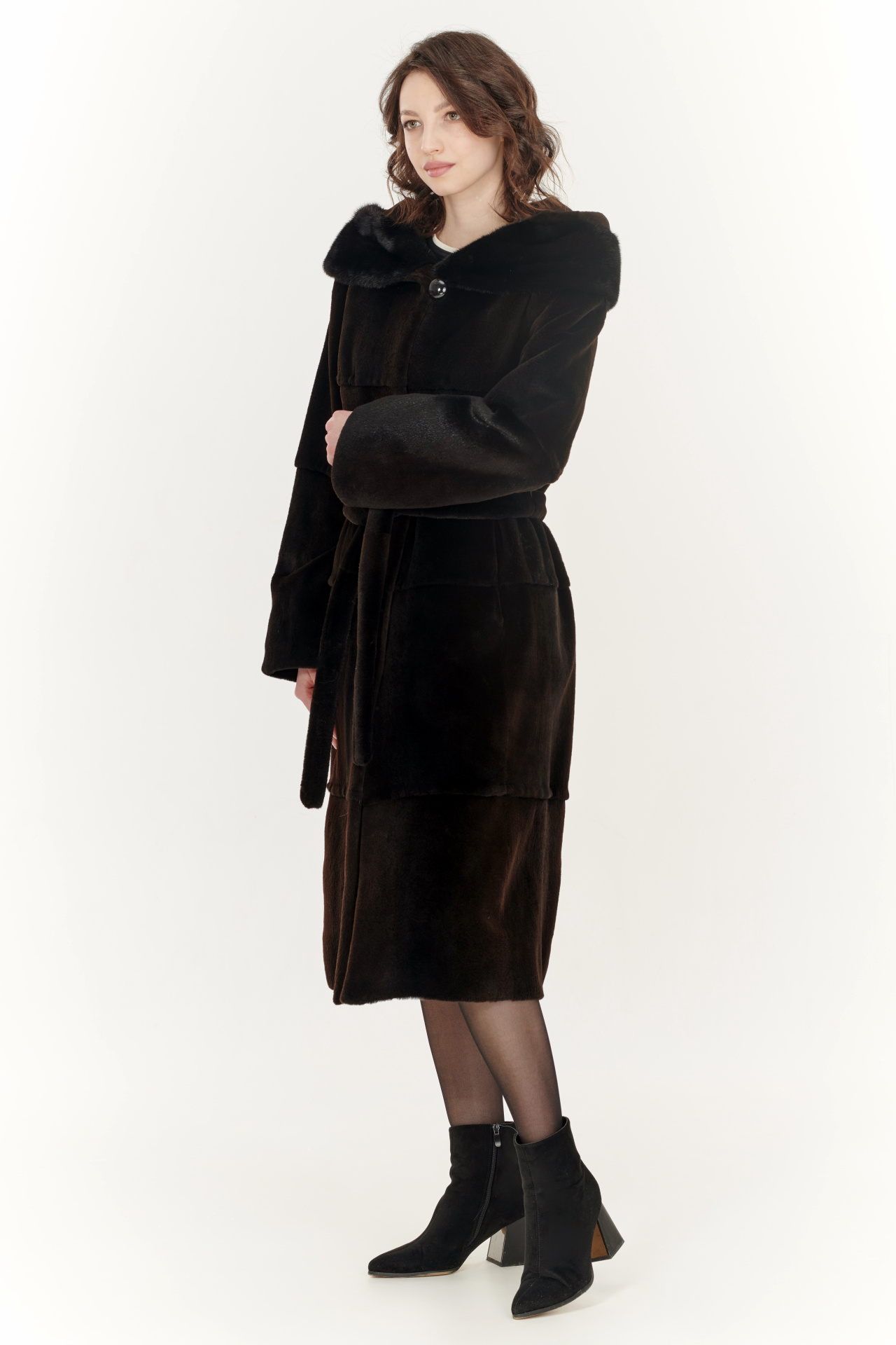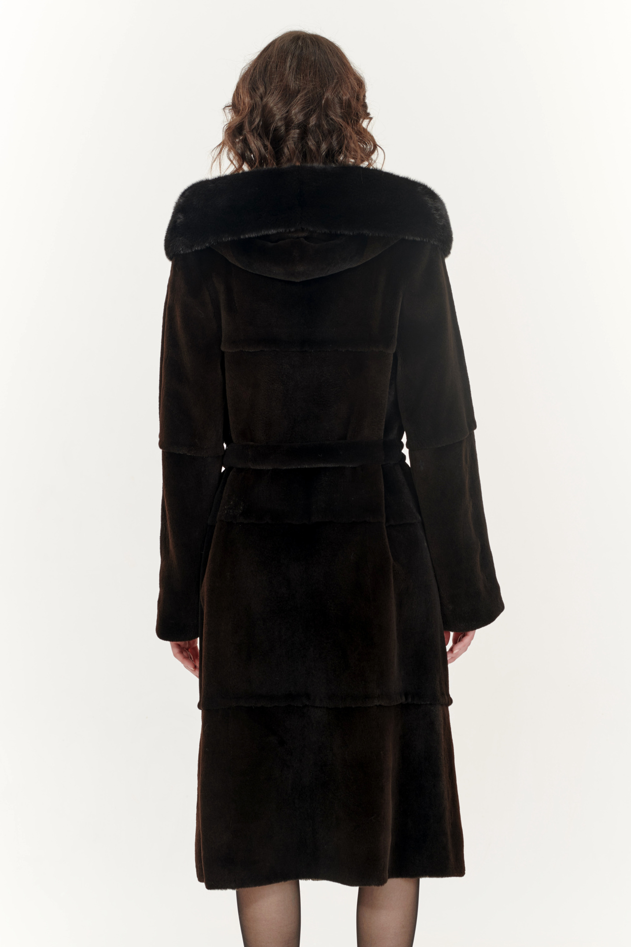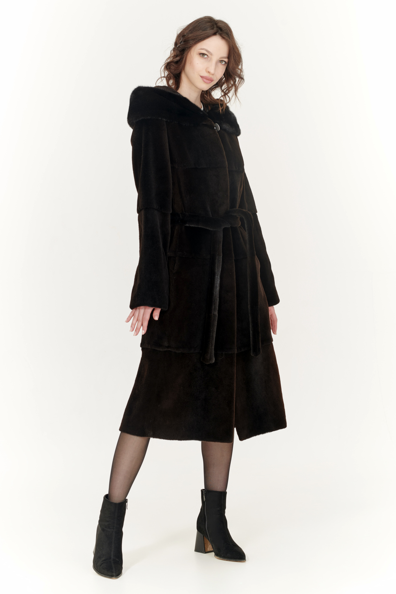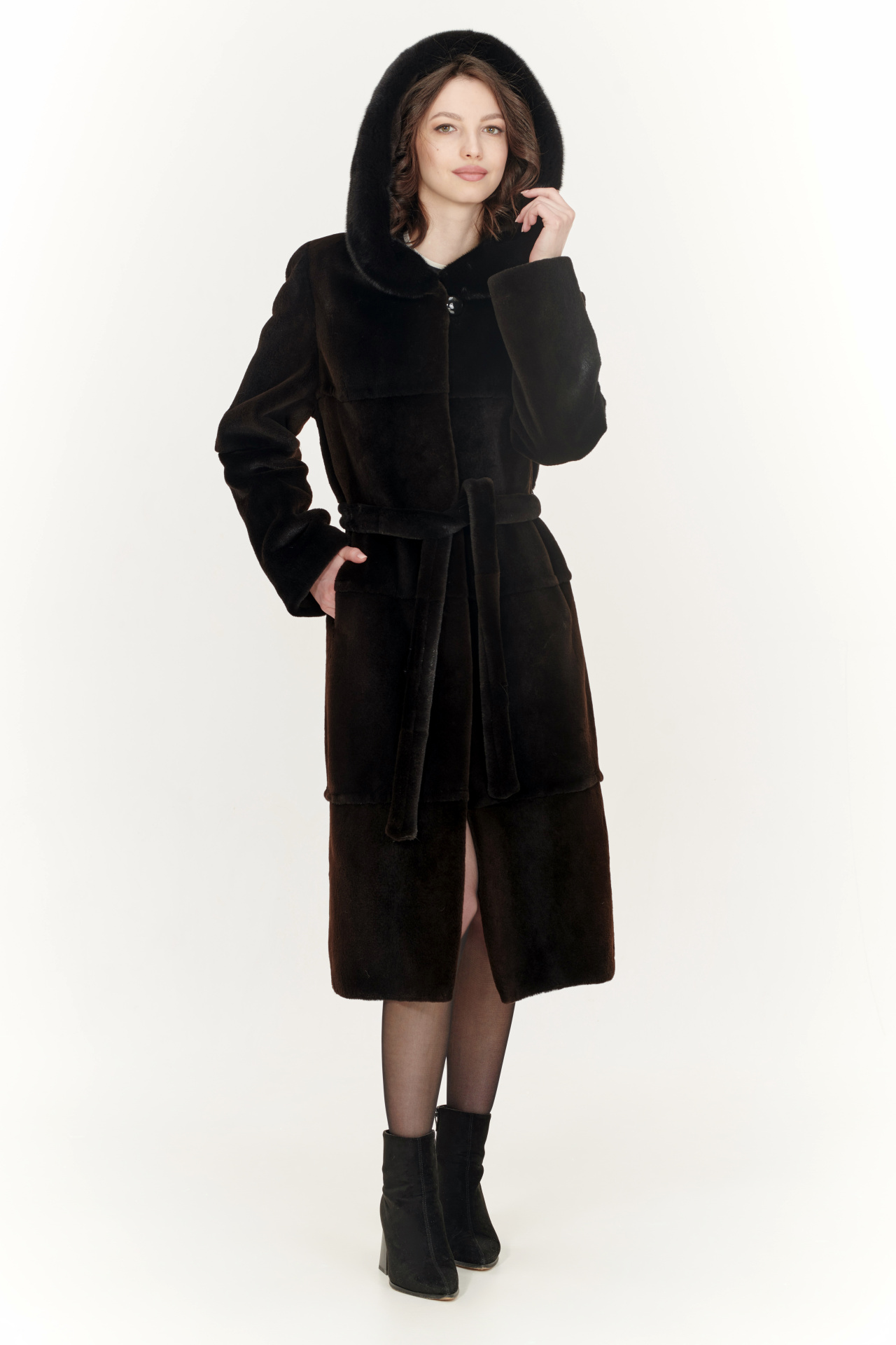 Лаконичная шуба из меха болотного бобра в коричневом цвете с отделкой из меха норки. Модель прямого силуэта с капюшоном, поясом, застежкой на шубные крючки и прорезными карманами.
