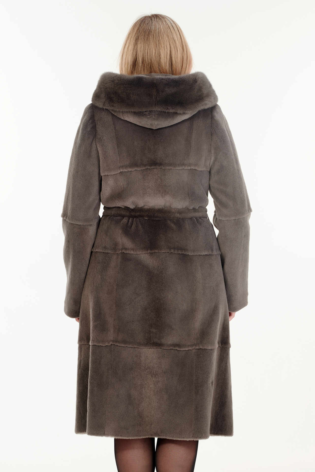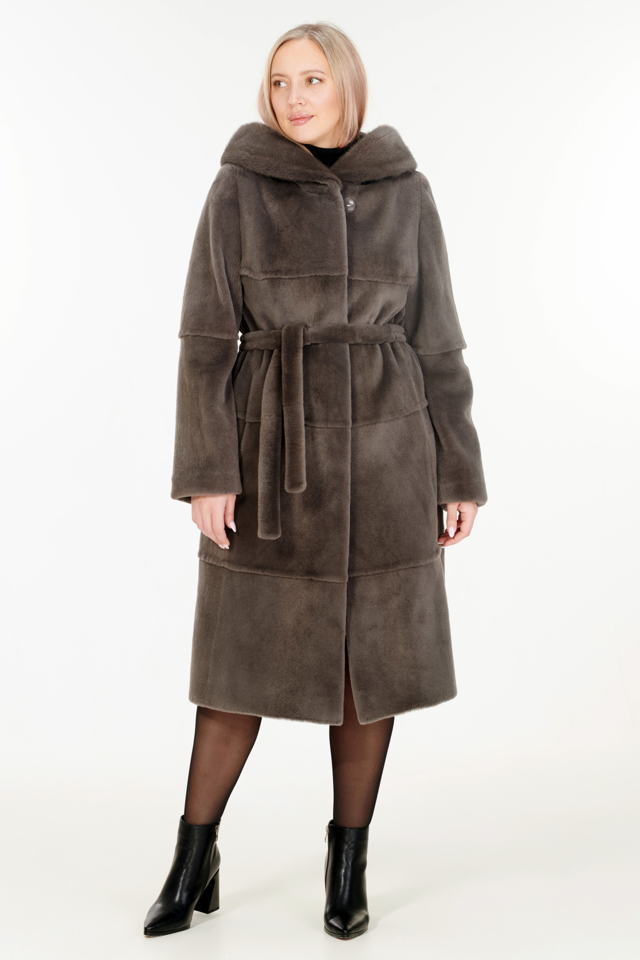 Шуба из меха болотного бобра в сером цвете с отделкой из меха норки. Модель прямого силуэта с капюшоном, поясом, застежкой на крючки и прорезными карманами.