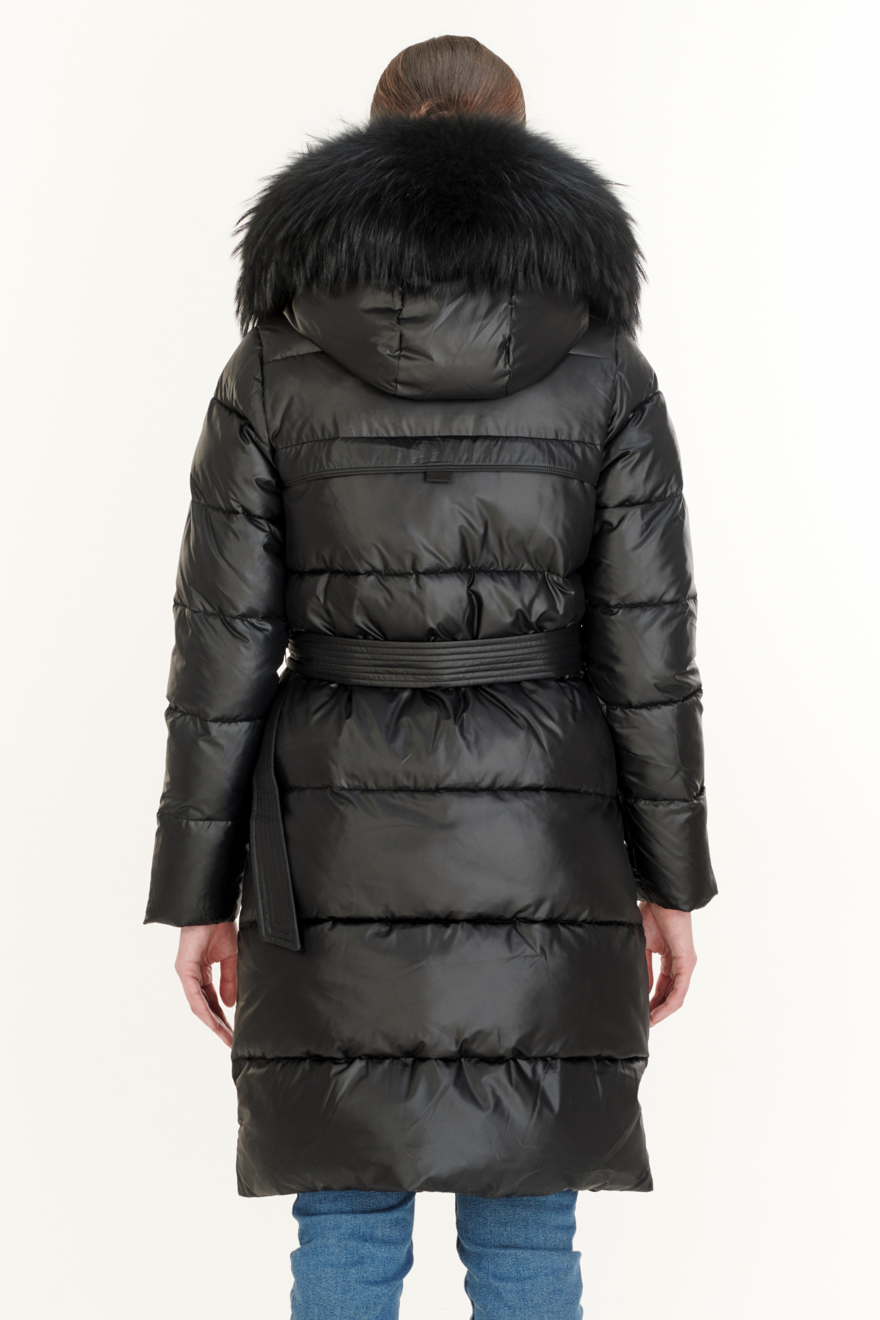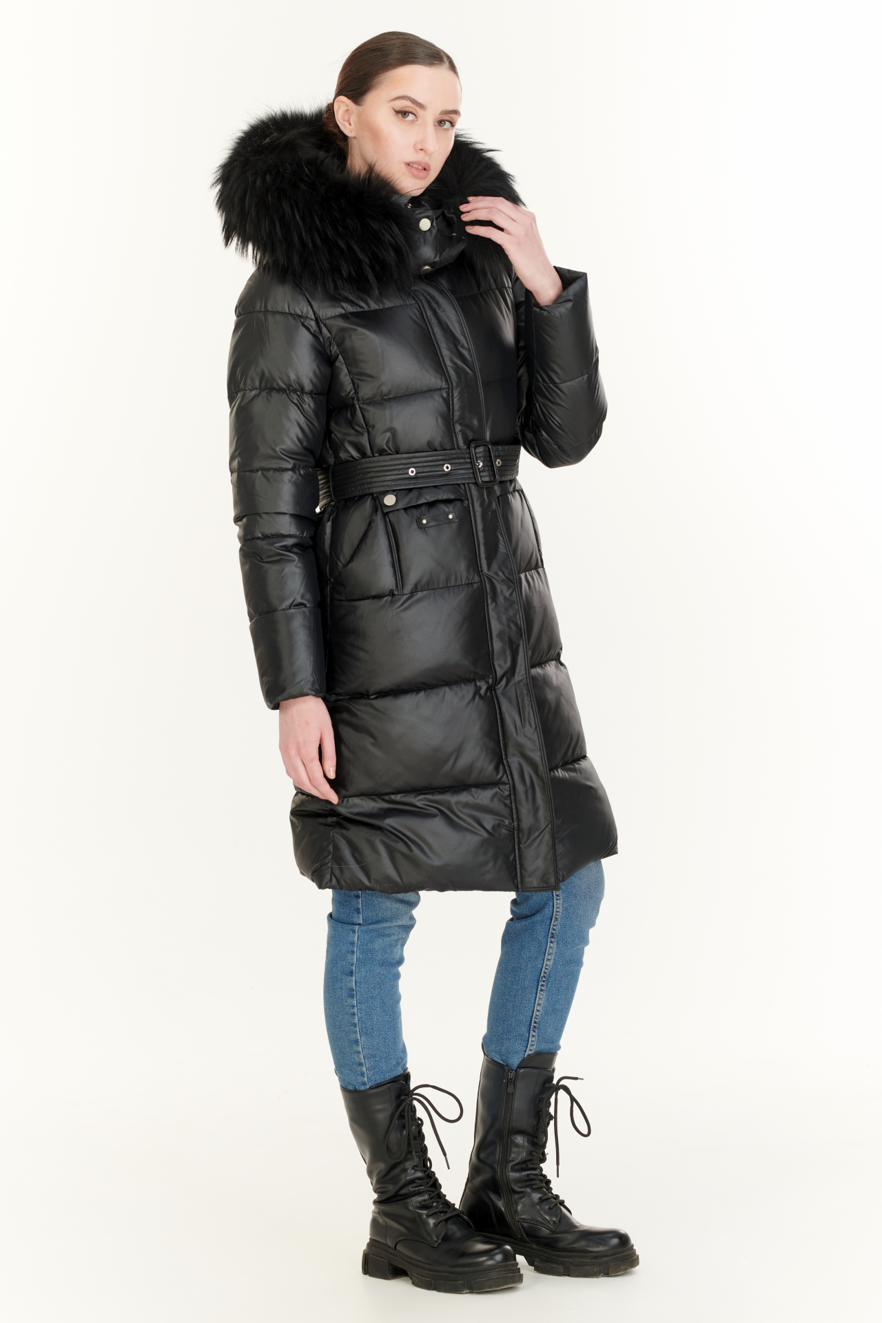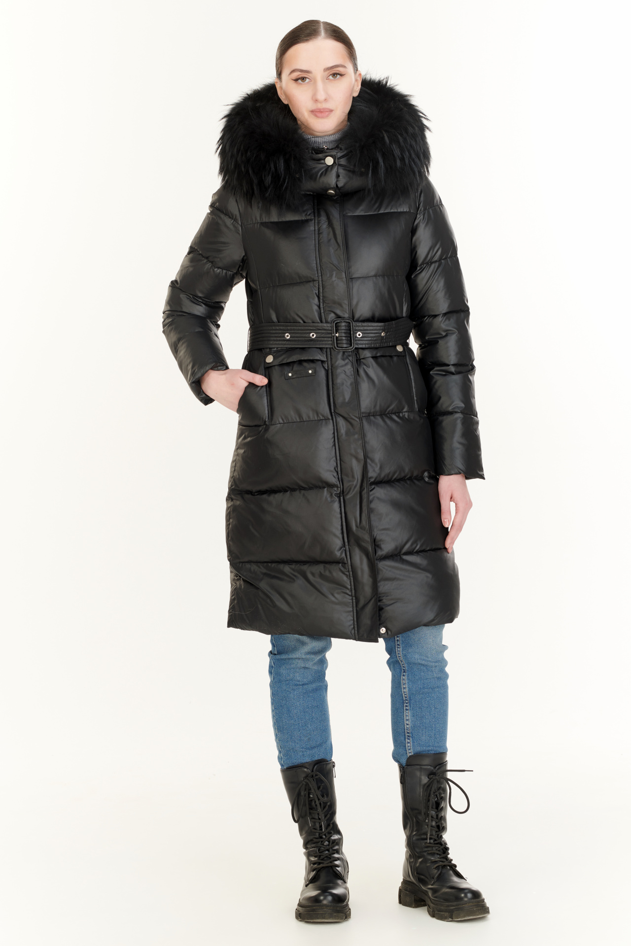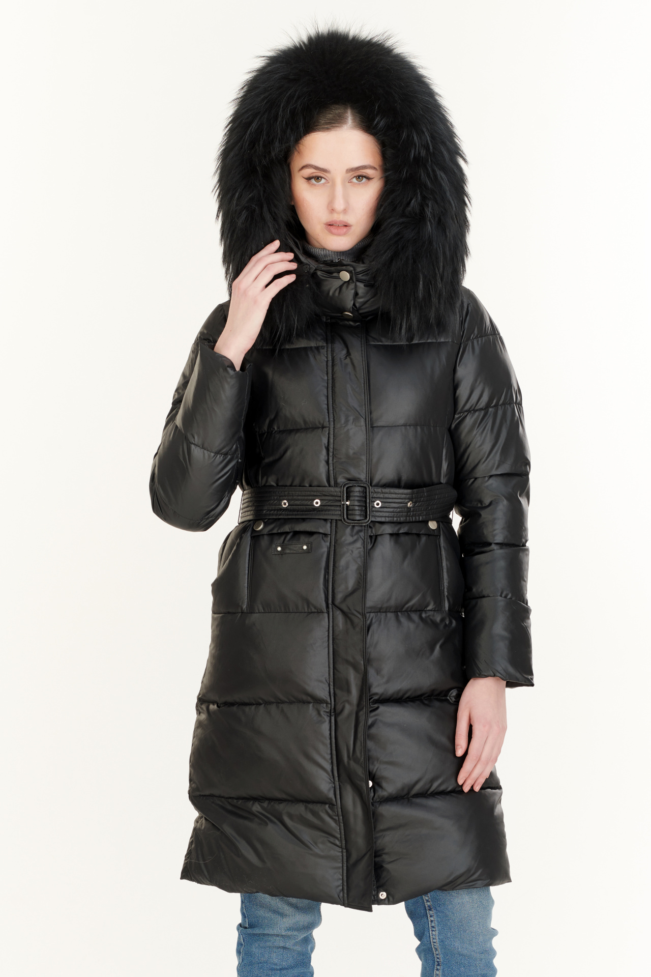 Утепленный пуховик в черном цвете. Модель прямого силуэта с капюшоном, прорезными карманами, застежкой на молнию и планку с кнопками. Отделка натуральный мех енота.