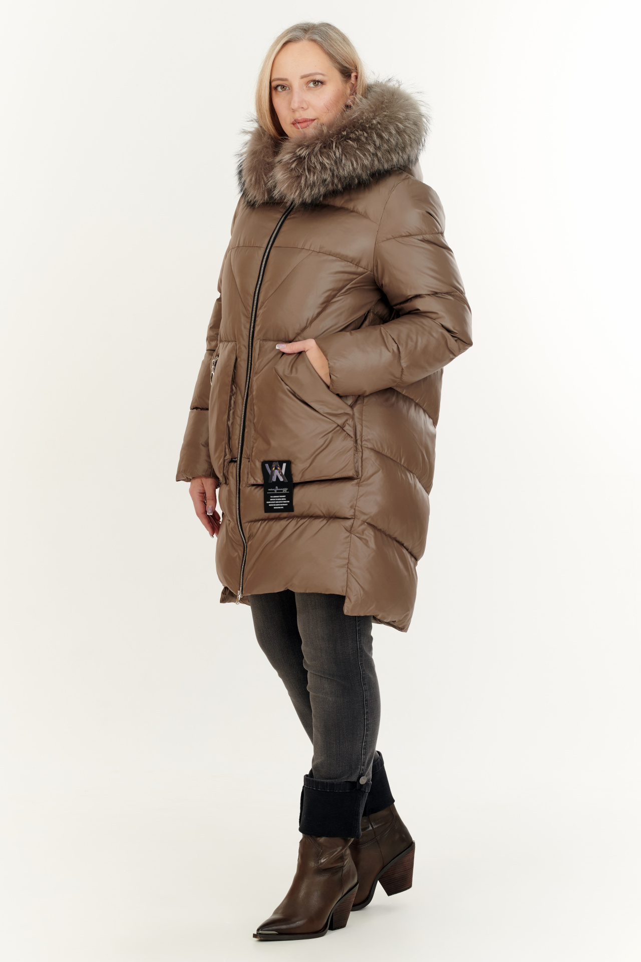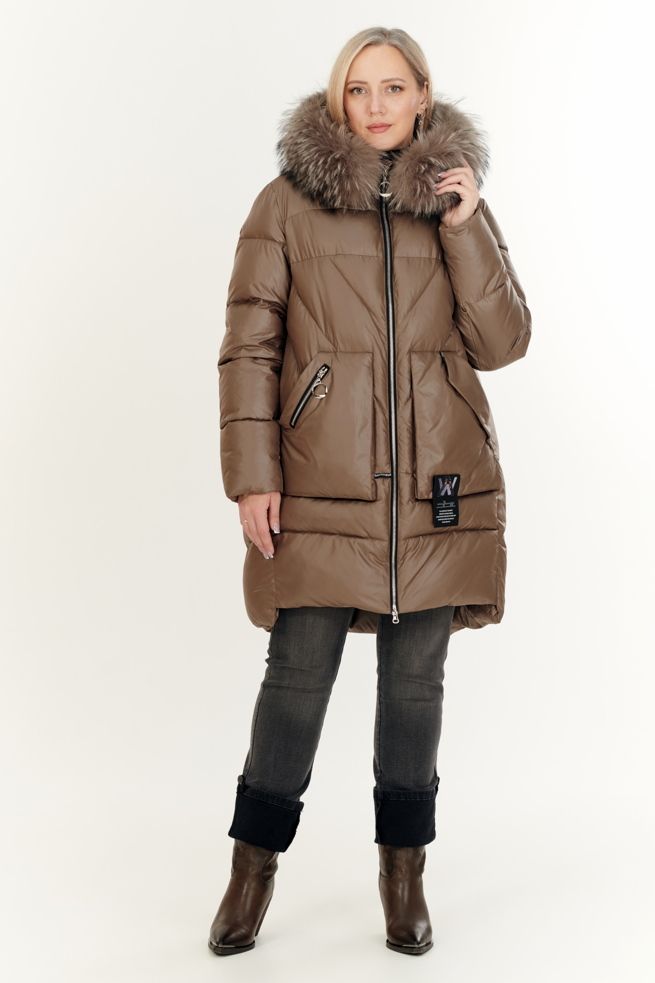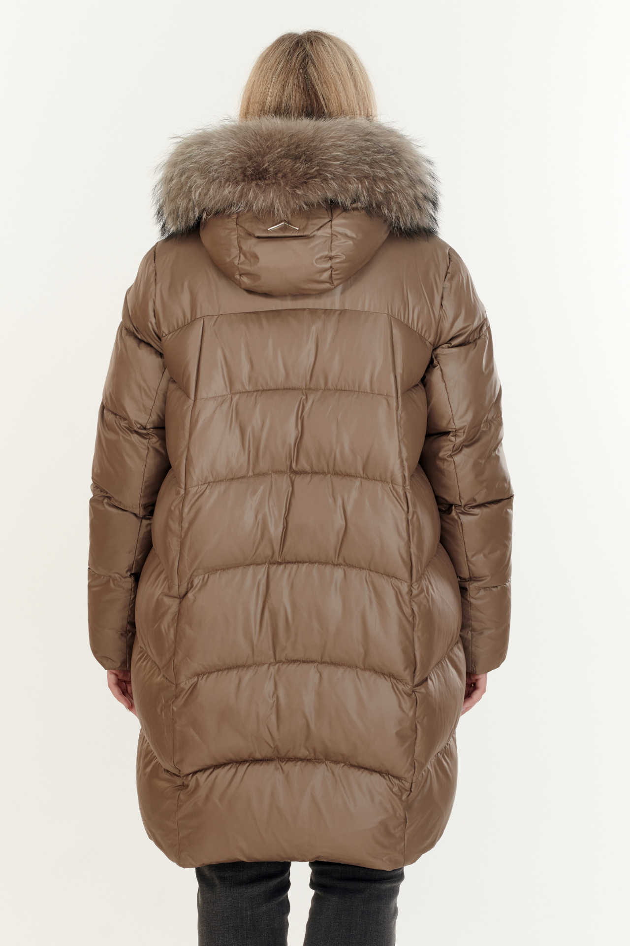Утепленный пуховик в шоколадном цвете. Модель прямого силуэта с капюшоном, накладными карманами и застежкой на молнию. Отделка натуральный мех енота.