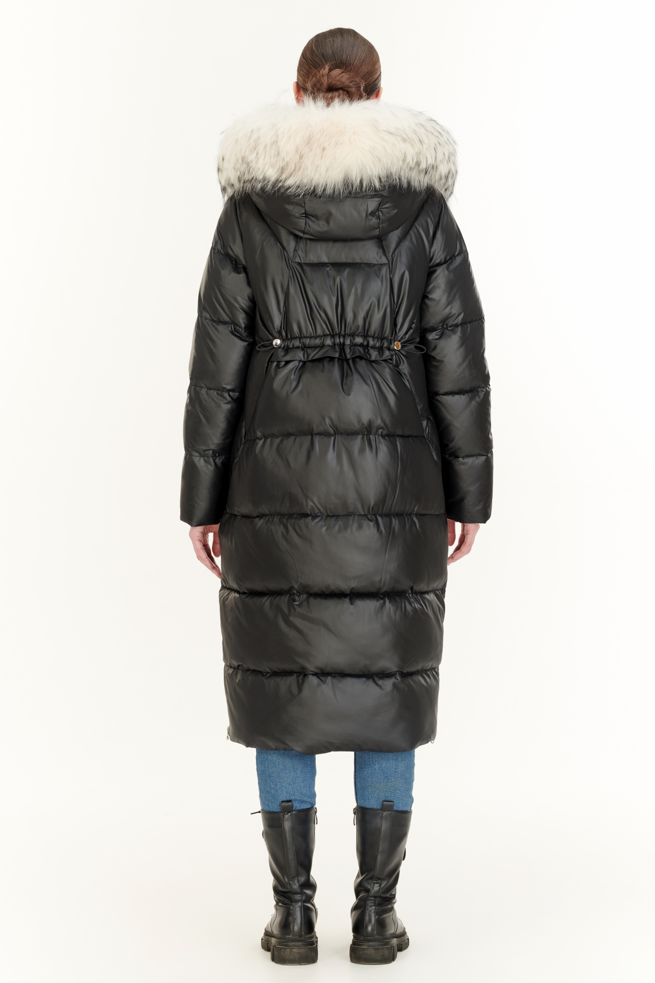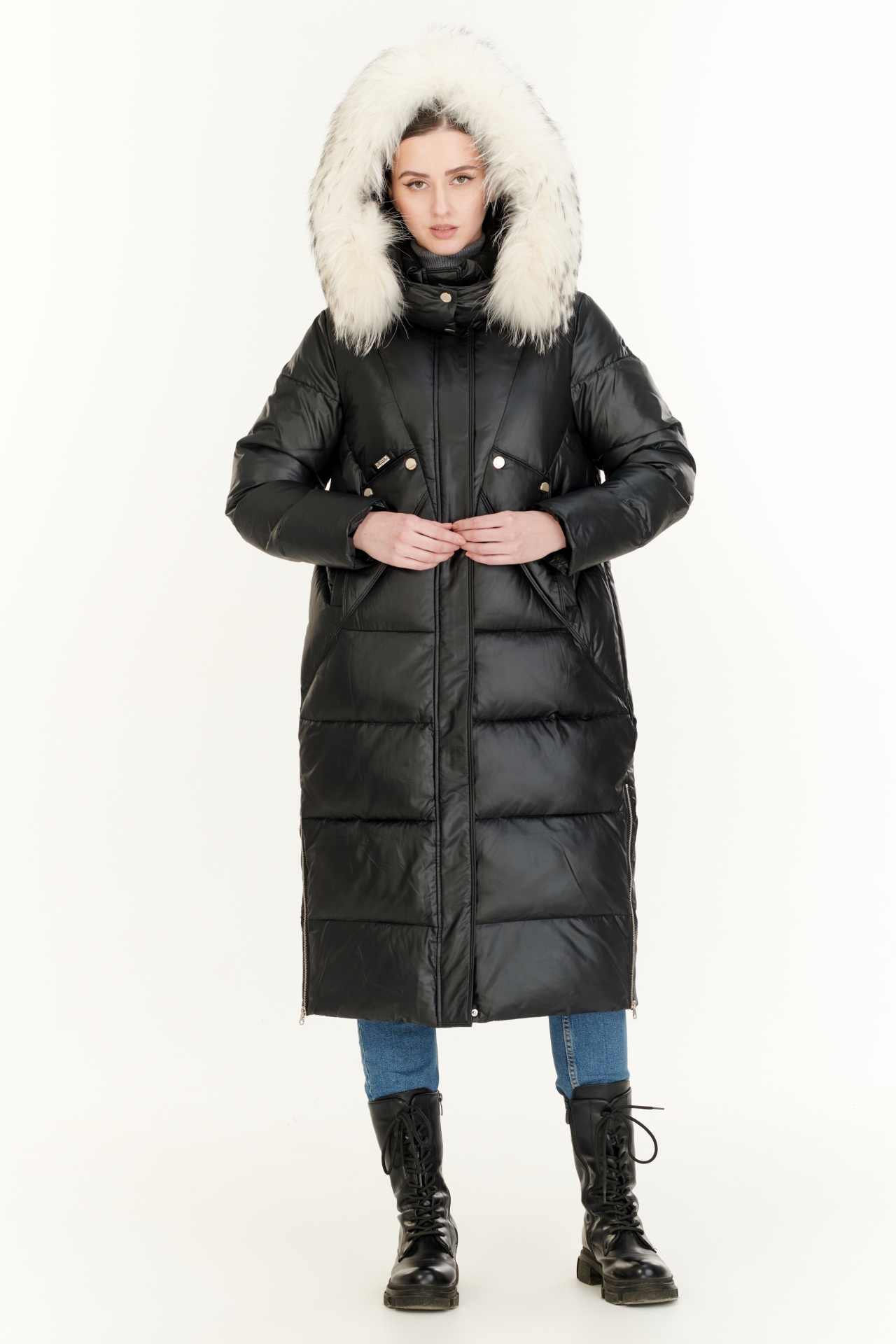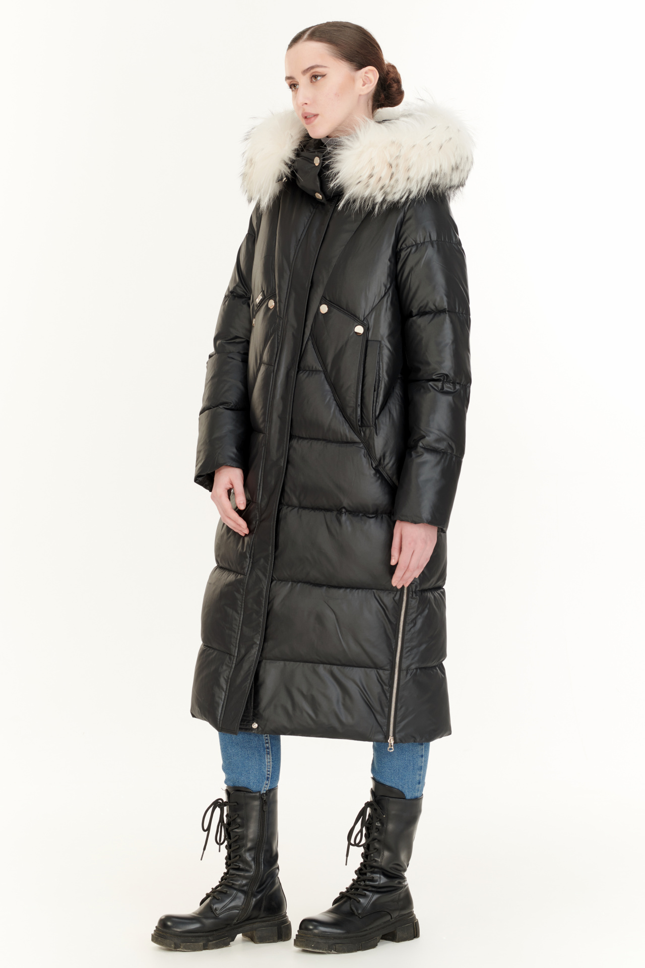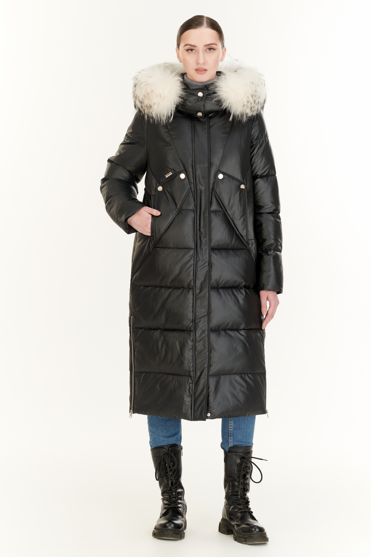 Утепленный пуховик в черном цвете. Модель прямого силуэта с капюшоном, прорезными карманами, застежкой на молнию и планку с кнопками. Отделка натуральный мех енота.